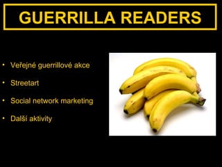 Veřejné guerrillové akceKnihy v tramvajích Přechod pro čtenáře Světový den knihy Videa z akcí: http://www.youtube.com/GuerrillaReaders