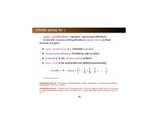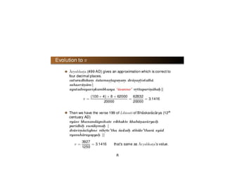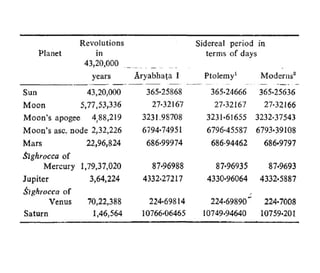Indian astronomy has a long history dating back to the Vedanga-jyotisha text from 1400 BCE. Key developments include Aryabhata's theory of Earth's rotation in 499 CE and Bhaskara II's non-circular planetary orbits in the 12th century. Indian astronomers made many advances in mathematics needed for accurate astronomical computations, including early work on trigonometric functions and the value of pi. Their models incorporated epicycles and were later revised by Nilakantha Somayaji in the 15th century to resemble a rudimentary heliocentric system.
