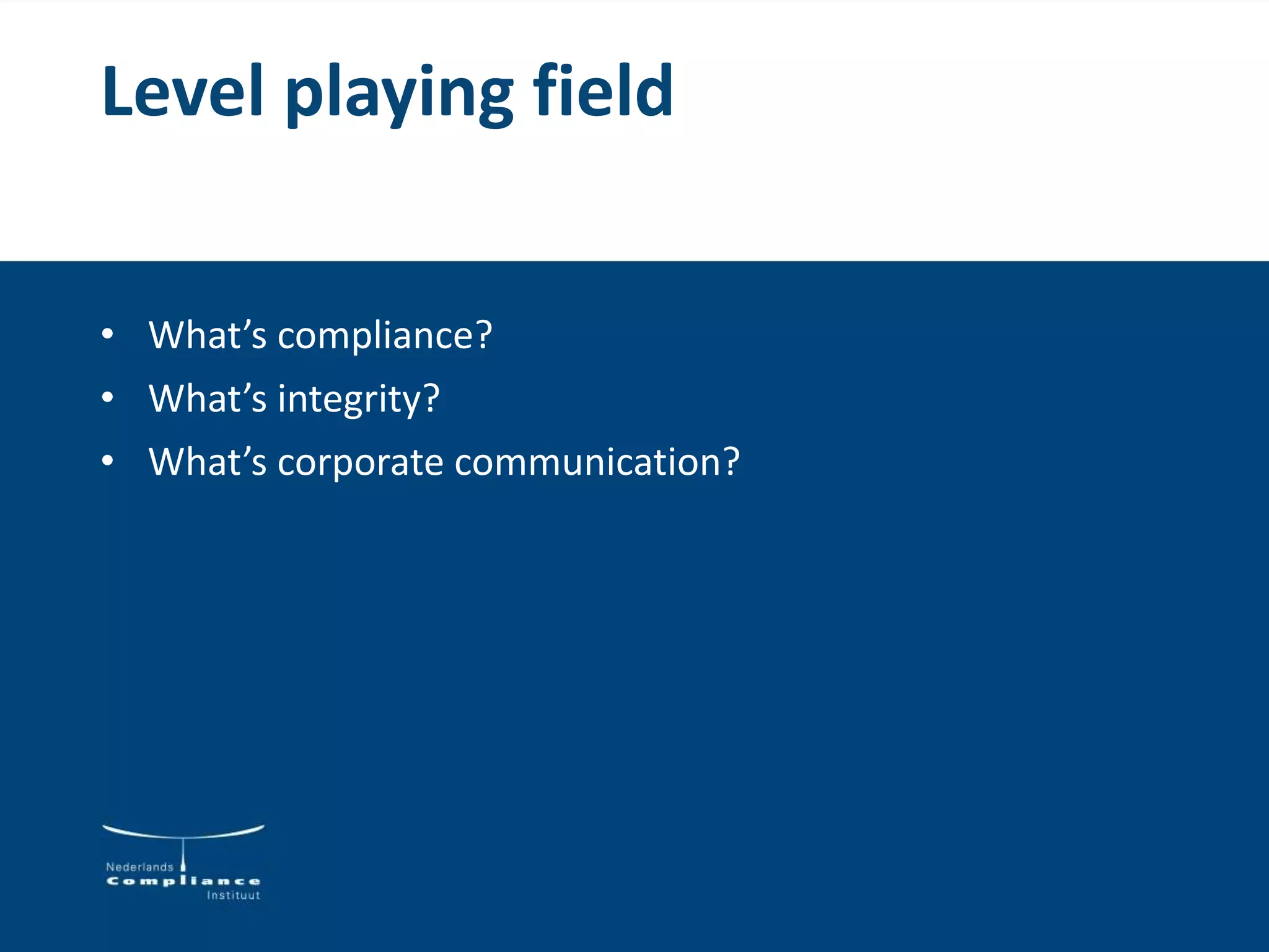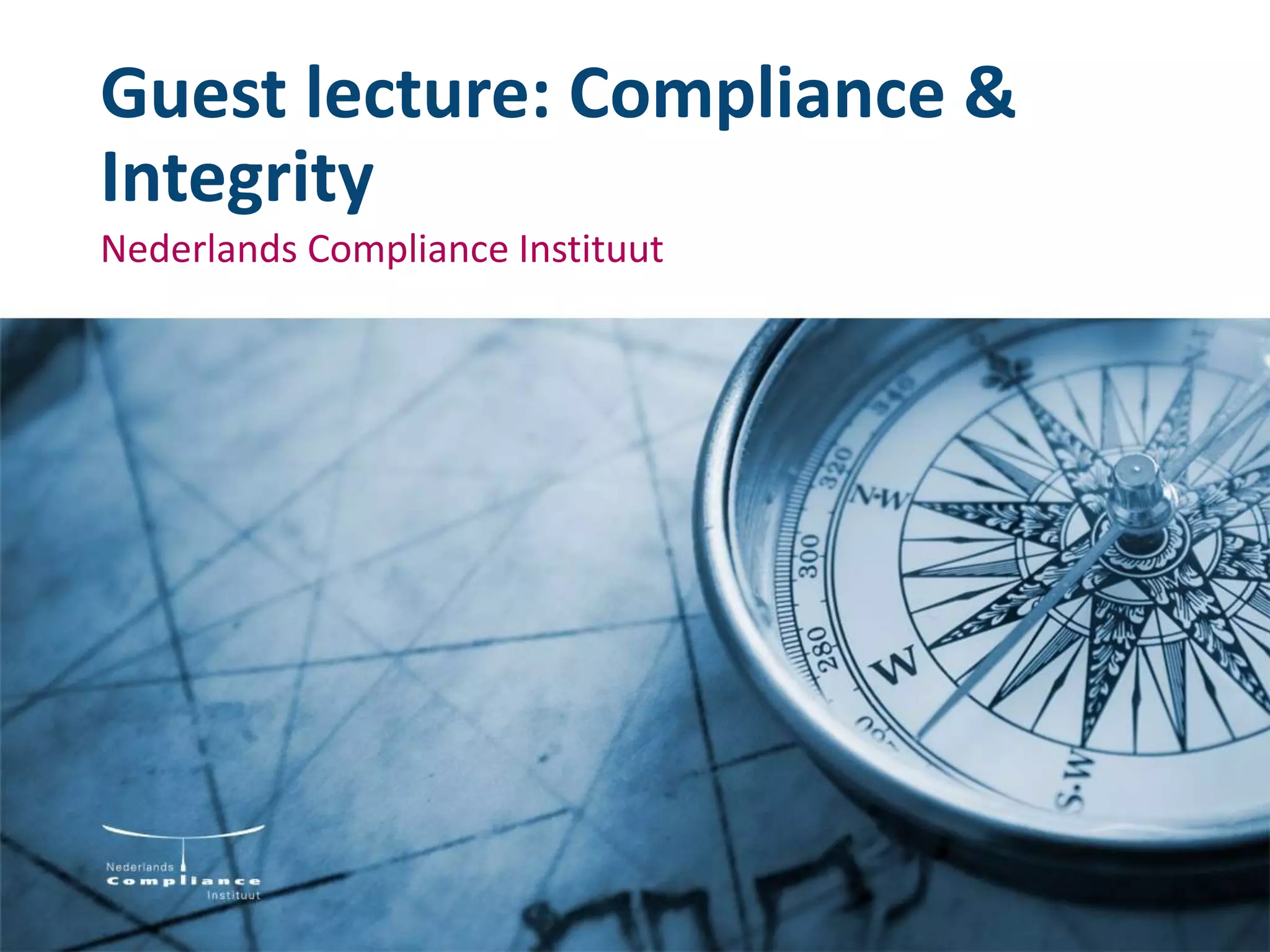 Roderick Noordhoek, a compliance officer, gave a guest lecture on compliance and integrity. He discussed the definitions and evolution of compliance from ensuring adherence to laws and regulations to also enabling values-based behavior. Integrity was defined as acting diligently, explainably, and with consistency over time after reflecting on all stakeholder interests. A license to operate requires integrity to gain broad societal acceptance. The role of compliance is to monitor laws and risks, advise on policies, explain policies, and monitor and report on behavior. Nudging and awareness of cognitive biases were discussed as ways to potentially influence values and decision-making, though it is unclear if this can ensure the right decisions are made. The future may see