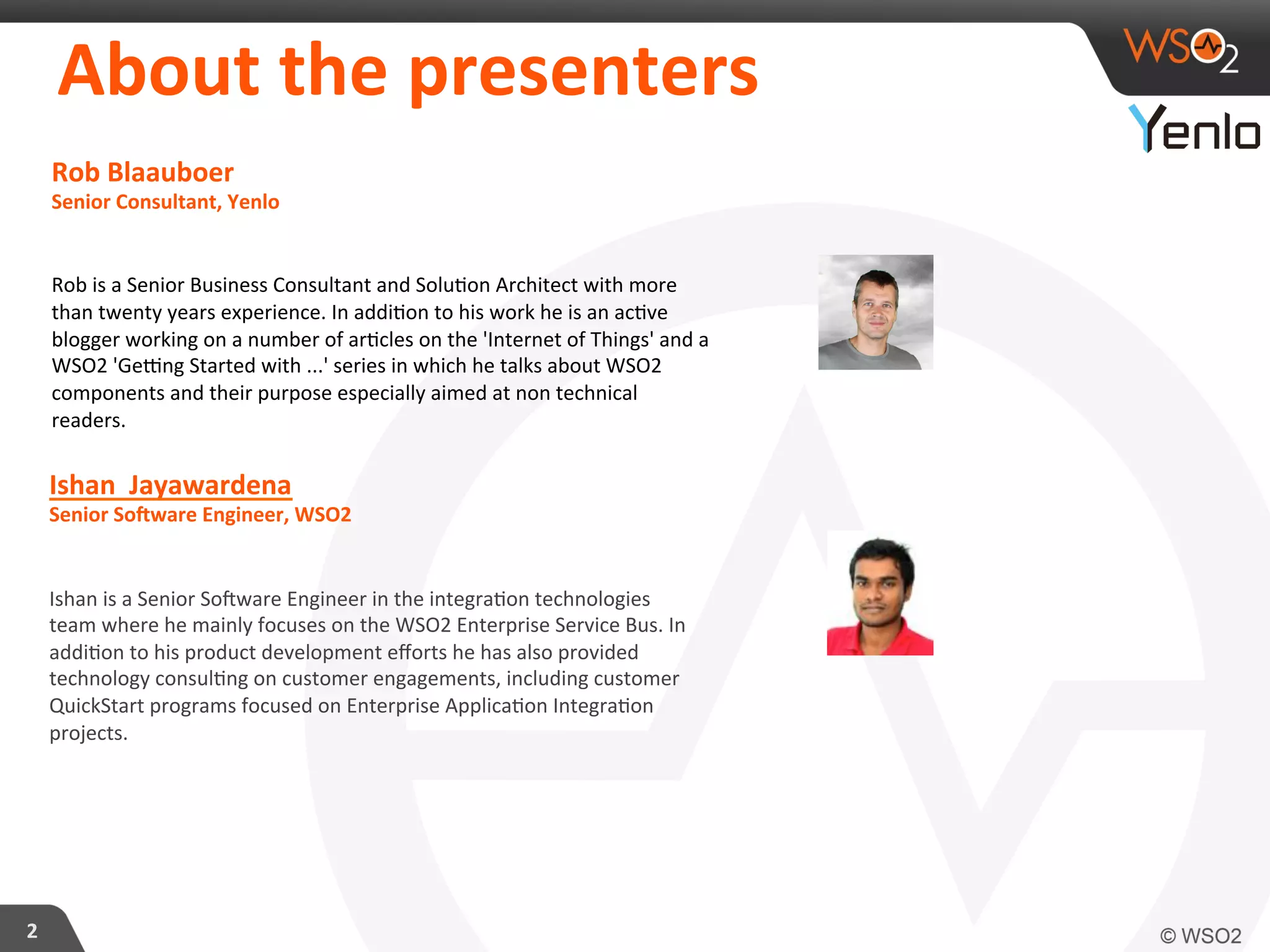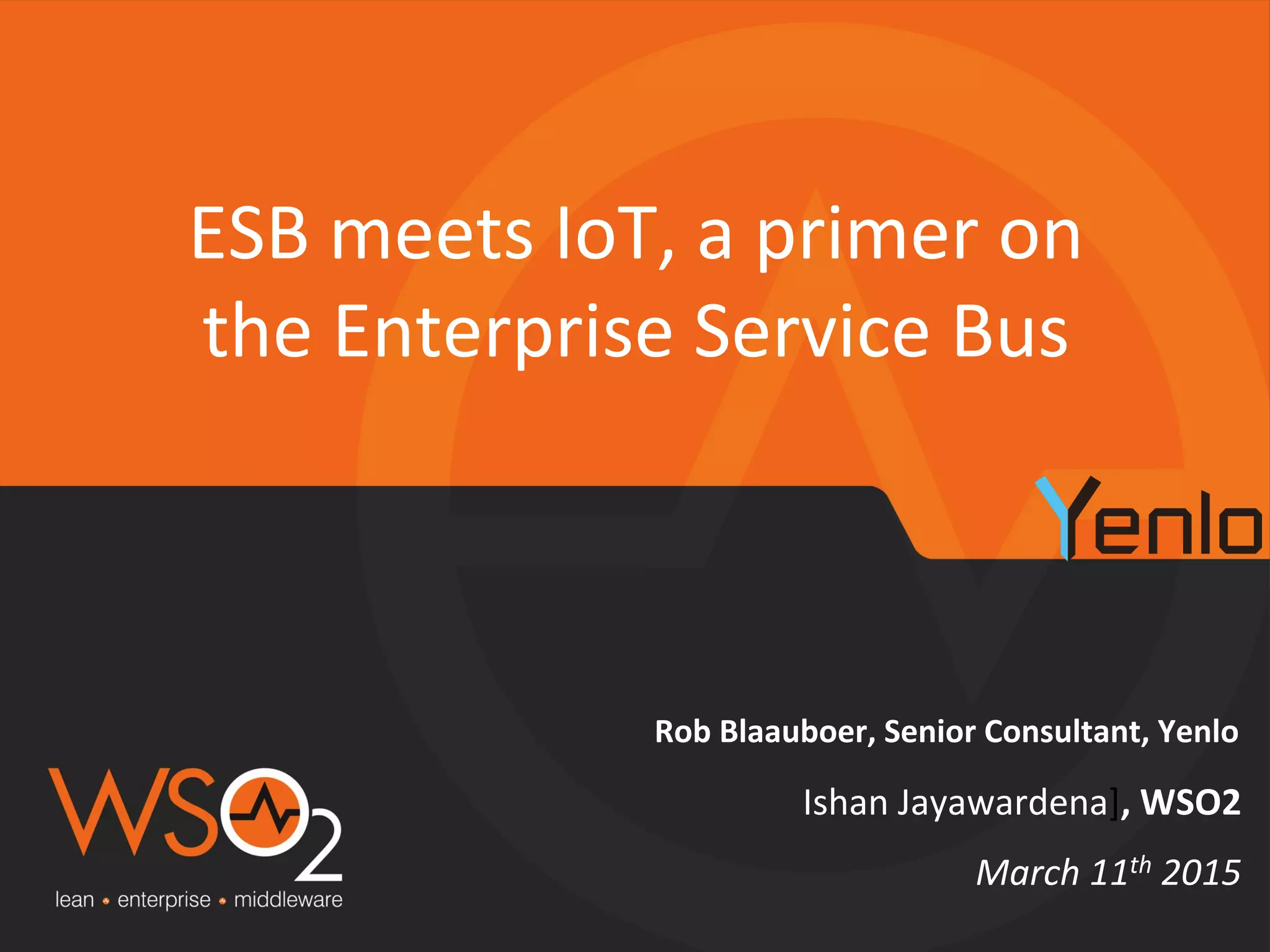 Rob Blaauboer and Ishan Jayawardena present an overview of the WSO2 Enterprise Service Bus (ESB), outlining its role in integrating diverse systems using a service-oriented architecture. The document discusses the evolution from monolithic and point-to-point systems to the use of ESBs for managing communication and data flow in enterprise environments. It also highlights the potential applications of the ESB in IoT scenarios and provides technical guidance for implementing the WSO2 ESB.
