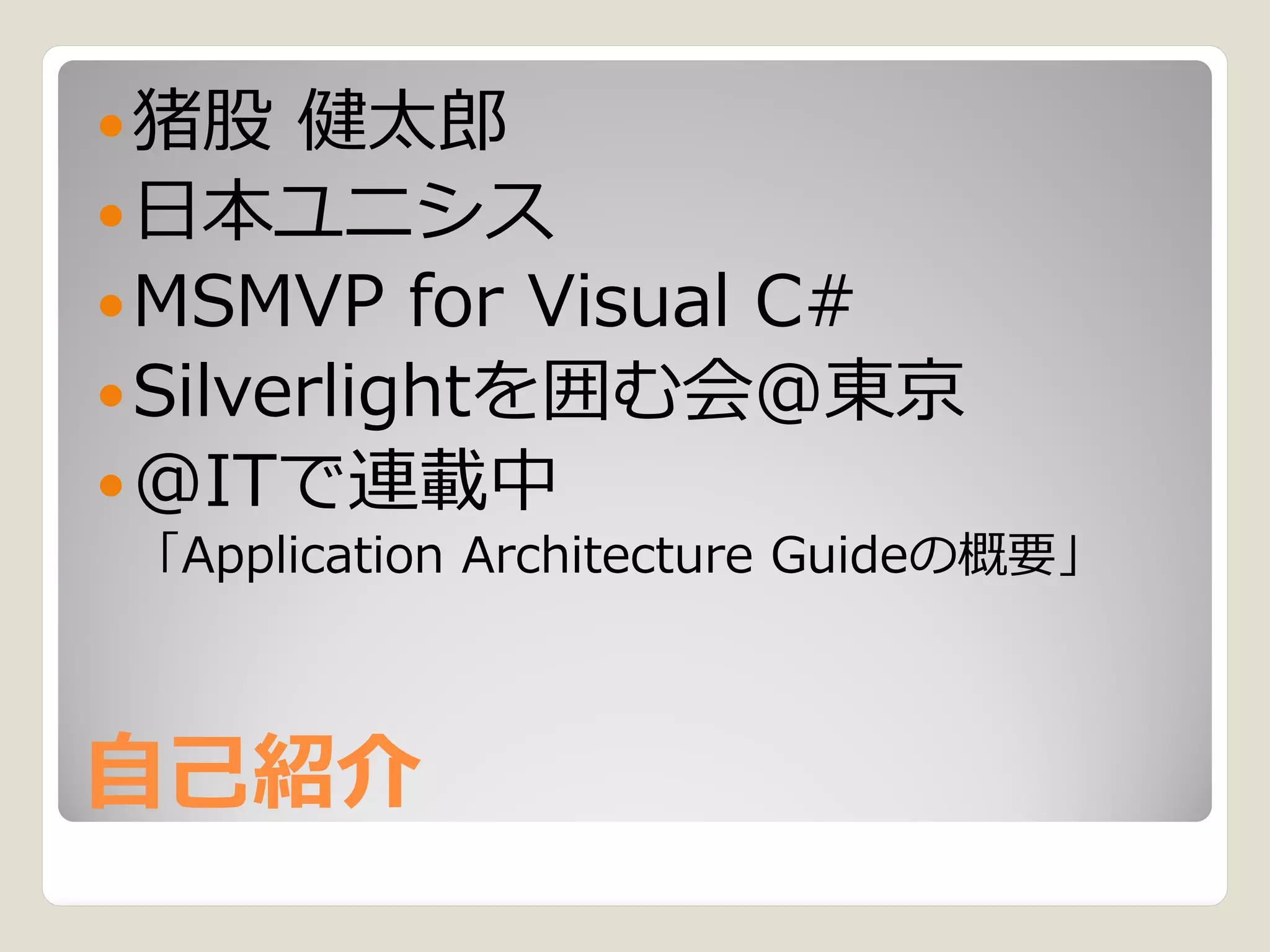 健太郎 日本ユニシス MSMVP for Visual C# Silverlightを囲む会@東京 @ITで連載中 「Application Architecture Guideの概要」 自己紹介