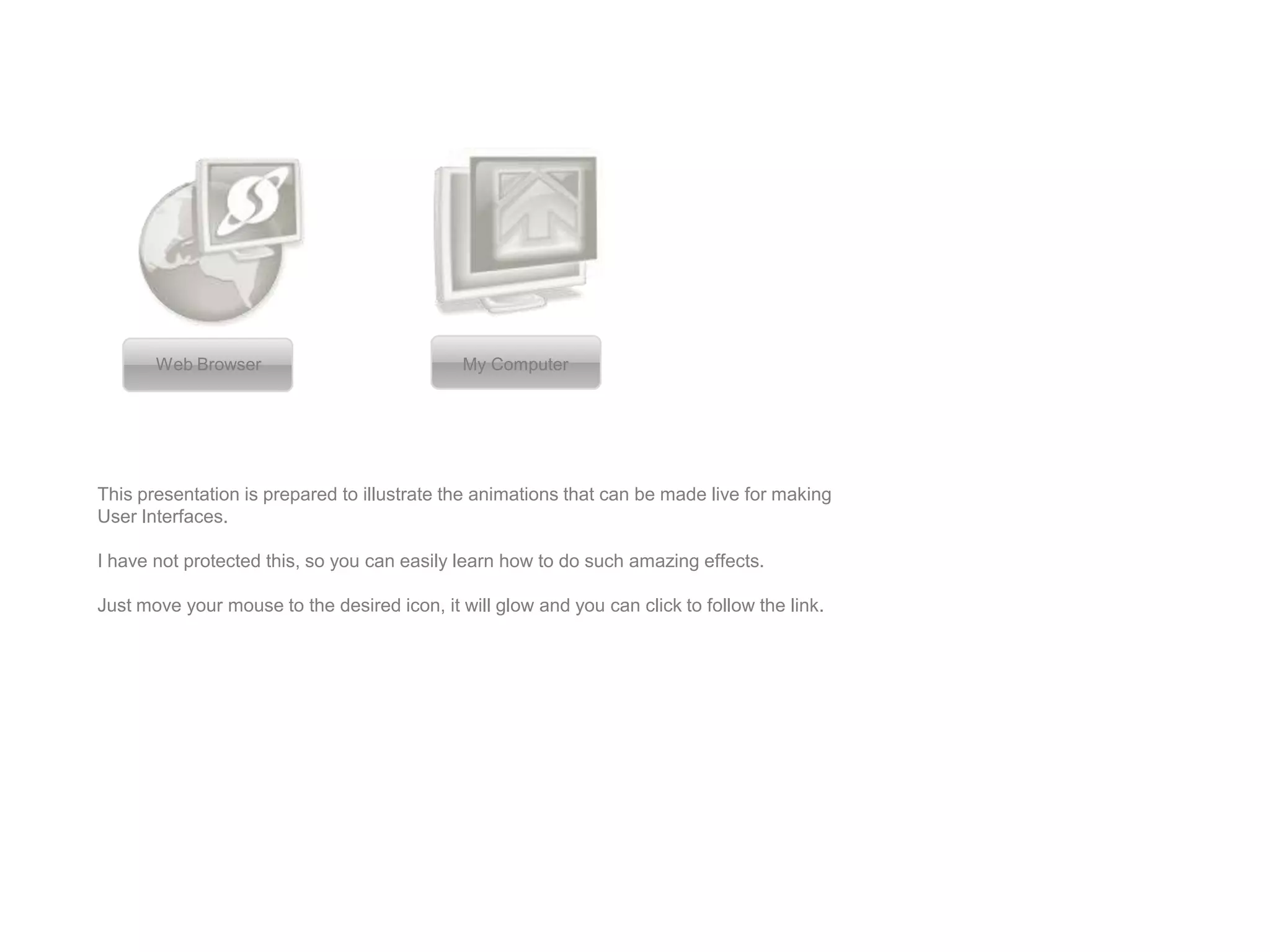 This presentation demonstrates animations that can be used to create interactive user interfaces, with the goal of teaching others how to reproduce these effects. The document instructs users to hover their mouse over icons, which will glow to indicate they can be clicked to follow the associated link, in order to experience the animations firsthand.