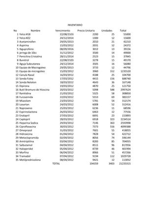 Nombre Vencimiento Precio Unitario Unidades Toltal 1 Yelco #18 22/08/2103 2200 25 55000 2 Yelco #22 24/12/2014 1300 12 15600 3 Acetaminofen 29/05/2013 2010 21 42210 4 Aspirina 15/03/2012 2031 12 24372 5 Ibguprofeno 08/09/2016 3012 13 39156 6 jeringa de 10cc 31/12/2012 3500 14 49000 7 Penicilina Cristalina 28/11/2014 2523 15 37845 8 Buretrol 22/08/2103 3278 15 49170 9 Aguja Subcutanea 24/12/2014 3505 16 56080 10 Equipo de Macrogoteo 29/05/2013 3733 12 44796 11 Equipo de microgoteo 15/03/2012 3960 312 1235520 12 Canula Nasal 16/03/2012 4188 25 104700 13 Sonda Foley 17/03/2012 4415 156 688740 14 Sonda Nelaton 18/03/2012 4643 36 167148 15 Dipirona 19/03/2012 4870 25 121750 16 Butil Bromuro de Hioscina 20/03/2012 5098 588 2997624 17 Ranitidina 21/03/2012 5325 58 308850 18 Furosemida 22/03/2012 5553 69 383157 19 Miazolam 23/03/2012 5781 54 312174 20 Losartan 24/03/2012 6008 52 312416 21 Naproxeno 25/03/2012 6236 11 68596 22 Espirinolactona 26/03/2012 6463 12 77556 23 Enalapril 27/03/2012 6691 23 153893 24 Captopril 28/03/2012 6918 323 2234514 25 Heparina Sodica 29/03/2012 7146 363 2593998 26 Ciprofloxacina 30/03/2012 7373 556 4099388 27 Omeprazol 31/03/2012 7601 55 418055 28 Hidroxicina 01/04/2012 7828 54 422712 29 Metoclopramida 02/04/2012 8056 74 596144 30 Amitriptilina 03/04/2012 8283 85 704055 31 Salbutamol 04/04/2012 8511 96 817056 32 Haloperidol 05/04/2012 8739 46 401994 33 Morfina 06/04/2012 8966 51 457266 34 Tramadol 07/04/2012 9194 112 1029728 35 Metilprednisolona 08/04/2012 9421 12 113052 TOTAL 194359 3403 21233315