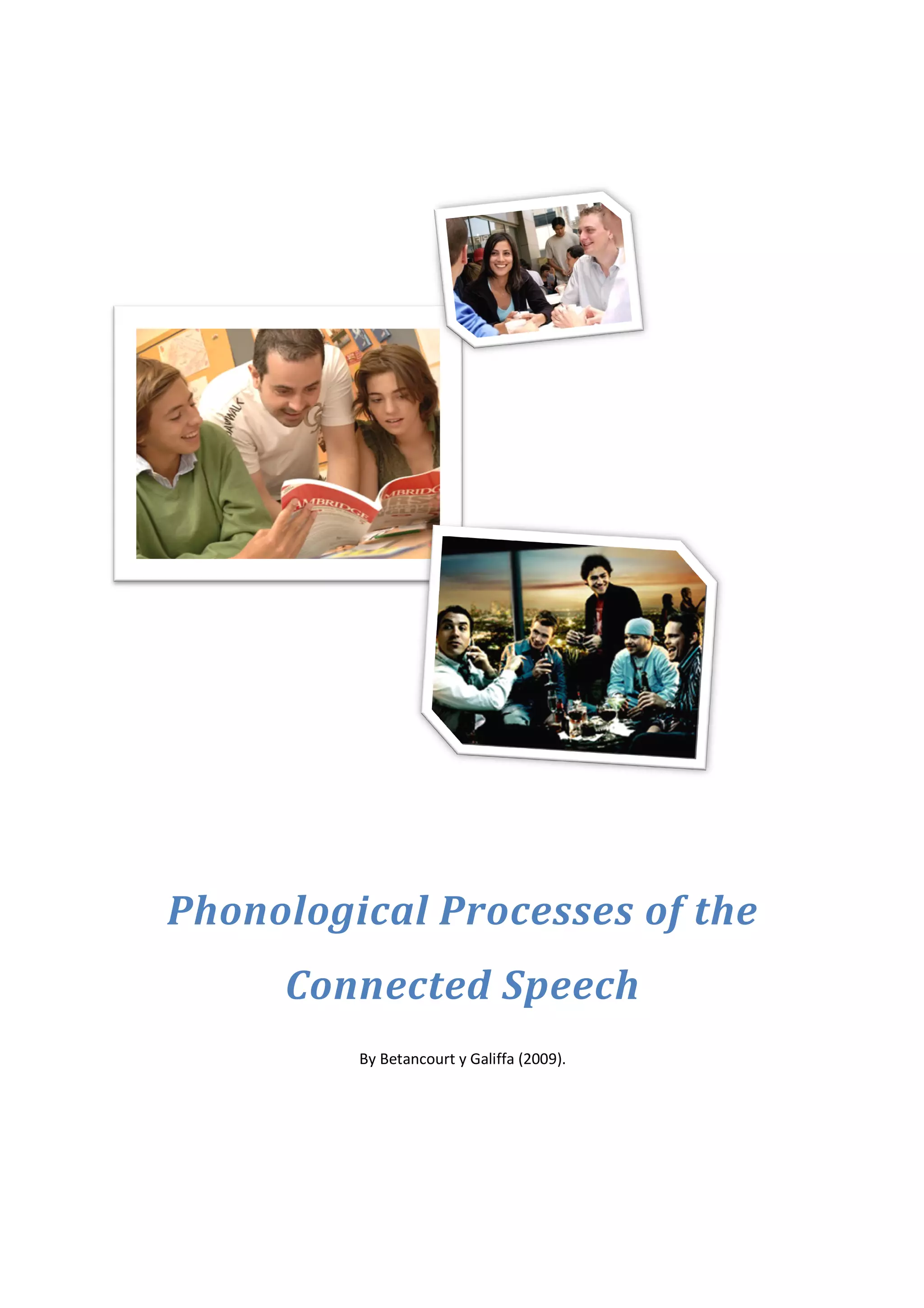 This document defines phonology and phonetics and their roles in language learning. [1] Phonology describes how sounds function and are organized in a language to convey meaning, while phonetics studies the physical properties of speech sounds. [2] The document then provides examples of phonetic transcription and discusses phonological processes in connected speech. [3] Phonological processes refer to how the brain instructs the speech apparatus to pronounce words and segments, and how sounds can change in normal speech flow or over time according to phonological principles.