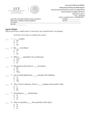 This document provides a study guide for an English class, including multiple choice questions testing grammar concepts like verbs, articles, prepositions and plural nouns. It also includes fill-in-the-blank, matching, ordering and true/false exercises related to topics like family, classrooms, apartments and directions around towns. The study guide is meant to help students learn English grammar and vocabulary through a variety of exercise types testing comprehension.