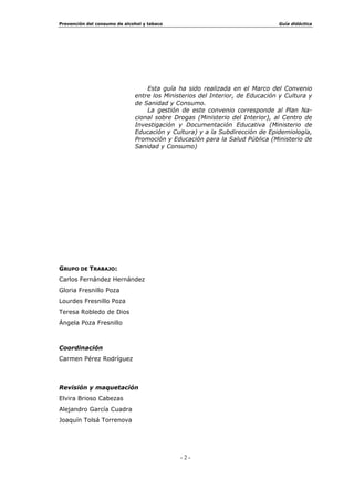 This document presents guidelines for preventing alcohol and tobacco consumption among youth. It was created through an agreement between the Spanish Ministries of Interior, Education and Health. The guidelines provide an introduction to prevention in schools and basic concepts about alcohol and tobacco use. It then proposes a model for a prevention program that would use various activities to educate youth about the risks of alcohol and tobacco and promote healthy behaviors. The program aims to raise awareness and provide youth with information to make responsible decisions.