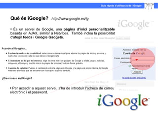 És un serveide Google, una página d'inici personalitzable basada en AJAX, similar a Netvibes. També inclou la possibilitat d'afegir feeds i Google Gadgets . Què és iGoogle? http://www.google.es/ig Per accedir a aquest servei, s'ha de introduir l'adreça de correu electrònic i el password.