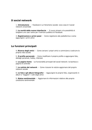 La guida di Daniele Cerra su Facebook esplora il funzionamento e le caratteristiche di questo social network, evidenziando l'importanza delle relazioni personali rispetto agli interessi condivisi. Viene descritta la registrazione, la gestione del profilo e le novità dell'interfaccia, inclusa la pubblicazione di contenuti multimediali. Facebook è presentato come un fenomeno sociale in continua evoluzione, che facilita il mantenimento dei contatti tra amici e conoscenti.