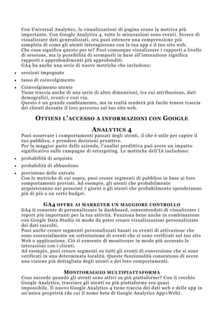 Google Analytics 4 (GA4) è un nuovo strumento di analisi che si basa su un modello di dati orientato agli eventi anziché alle sessioni, consentendo una maggiore flessibilità e analisi multipiattaforma. Rispetto a Universal Analytics, GA4 offre una dashboard rinnovata e nuove metriche, migliorando la capacità di analisi del comportamento degli utenti e la personalizzazione dei report. Questo strumento è progettato per facilitare il monitoraggio delle esperienze utente su più dispositivi e migliorare il processo decisionale per le strategie di marketing.