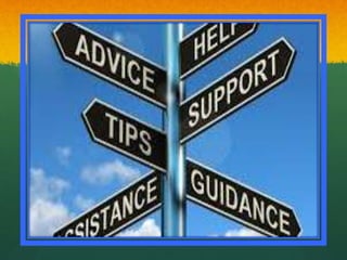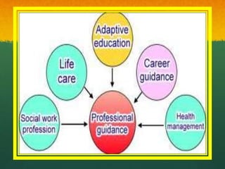 Guidance involves leading people down the right path, especially students. There are several types of guidance: educational guidance helps students with academic issues and choosing the right path; professional guidance matches individuals' skills and interests to suitable careers; psychological guidance addresses mental health issues like emotions and social adjustment; social guidance teaches rights and responsibilities to ensure people can adjust to society. Teachers provide educational guidance to help students navigate challenges and make good choices.