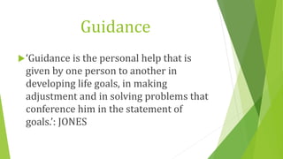 The document discusses the concepts and principles of guidance and counseling, highlighting the essential role of guidance in personal development and decision-making throughout different life stages. It outlines various types of guidance, including educational, vocational, and personal guidance, and emphasizes the importance of counseling in supporting students through their personal and psychological challenges. Key objectives of counseling include helping individuals solve problems, promoting mental health awareness, and facilitating positive behavior changes.