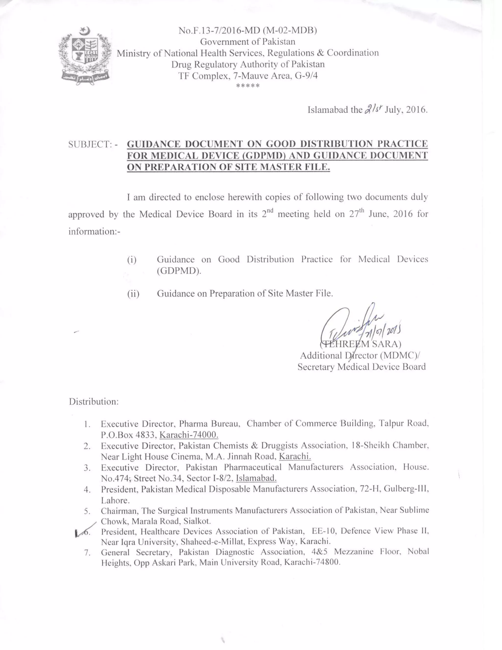 Guidance documents on Good Distribution Practices for Medical Devices and Site Master File as per Medical Devices Rule 2015 issued by Drug Regulatory Authority of PAKISTAN