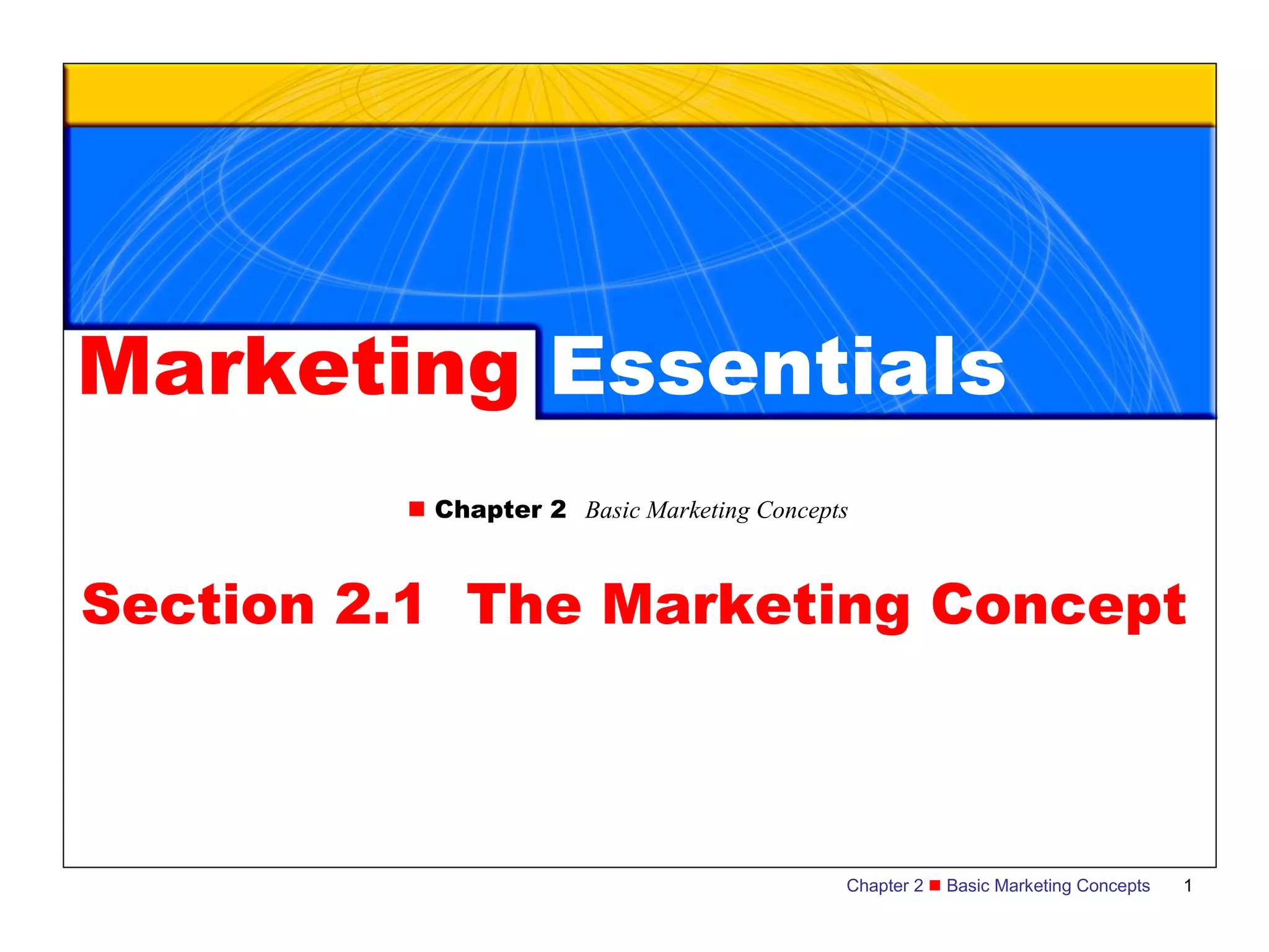 The document discusses key concepts in marketing including the marketing concept, customers vs consumers, defining a market, and the four Ps of the marketing mix. The marketing concept states that businesses must satisfy customer needs and wants to make a profit. A market includes potential customers who share needs and willingness to buy a product. The four Ps of the marketing mix are product, price, place, and promotion strategies used to market a product to its target market.