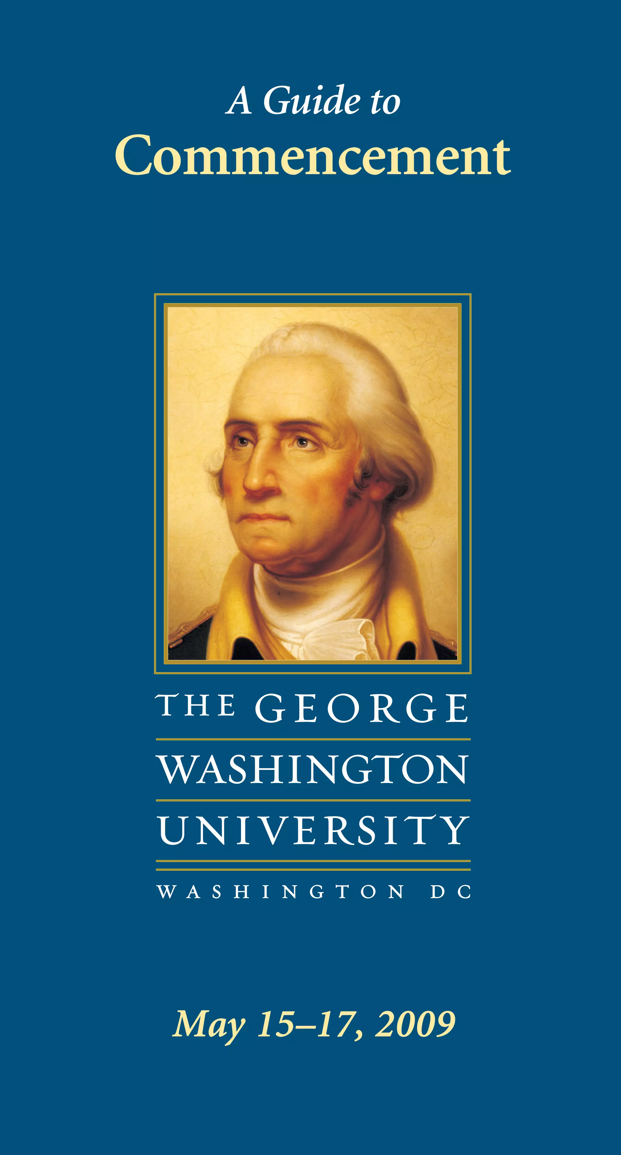 This document provides information about George Washington University's 2009 Commencement Weekend schedule of events from May 15-17. It includes details of the all-university Commencement ceremony that will take place on Sunday, May 17 at 10am on the National Mall. The document also provides logistical information for graduates and guests, such as transportation, seating, accommodations for disabilities, and an alternative venue plan in case events cannot be held on the Mall.