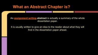 An abstract is a summary of the key points of a dissertation written to give readers an overview of its contents and encourage them to read further. It is important because professors often decide whether to read a dissertation based on its abstract. A good abstract creates a good impression and makes professors more likely to read the entire dissertation carefully. It briefly describes the topic, problem statement, research methodology, sample size, results, and significance of the research. The abstract should provide all this information concisely and clearly in a manner that grabs attention and persuades readers to explore the full dissertation.