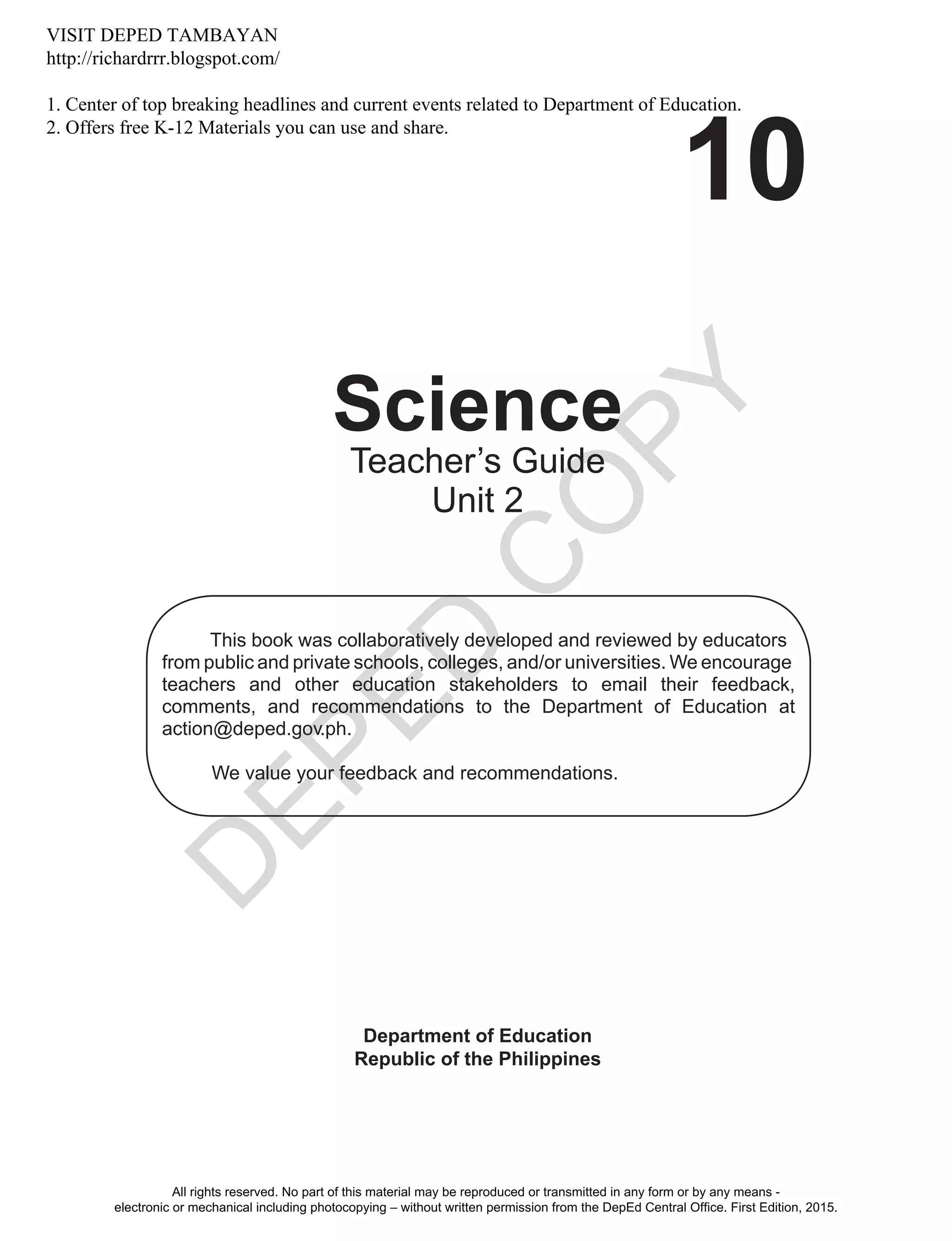 This document is a teacher's guide for the Grade 10 Science curriculum published by the Department of Education of the Philippines. It contains information about developing and reviewing the guide, copyright details, a table of contents that lists 11 modules covering topics like electricity, magnetism, the electromagnetic spectrum, light and mirrors, and a conceptual framework for the K-12 Science curriculum. The purpose is to provide teachers with resources and activities to teach essential science concepts and develop students' skills in scientific inquiry.