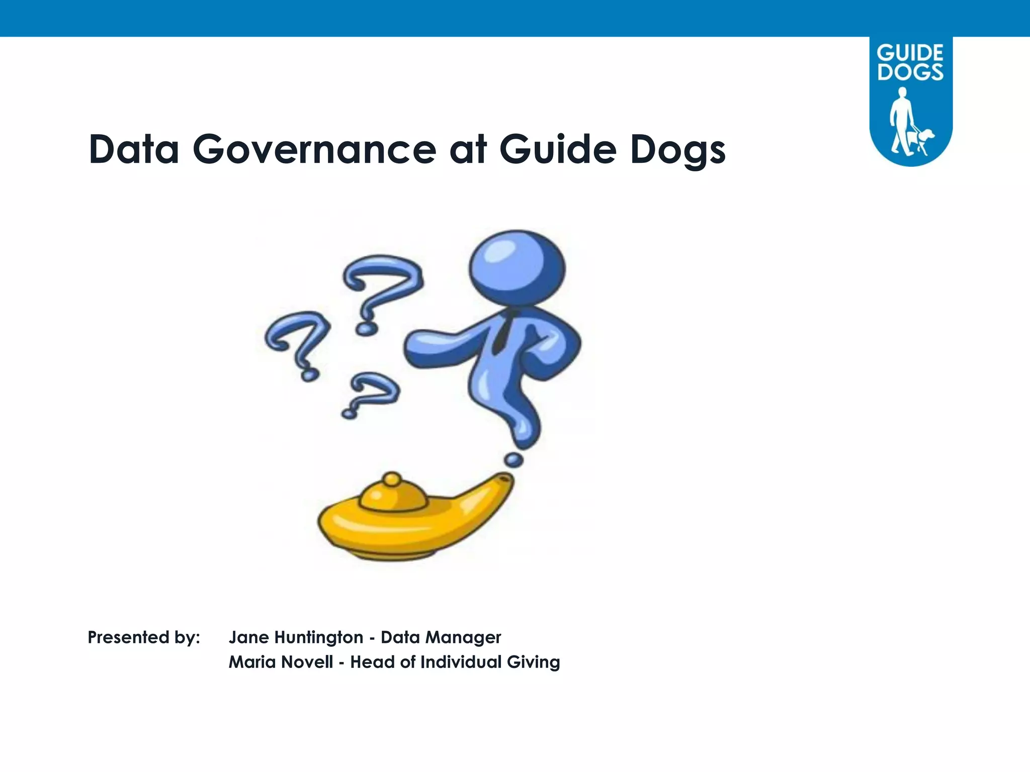 This document discusses data governance at Guide Dogs. It introduces data governance and defines it. It explains why data governance is important due to Guide Dogs' growing programs, systems, and locations. It describes how Guide Dogs is ensuring data is handled compliantly across the organization through a Data Governance Board. The board addresses issues, defines data elements, and agrees on data quality and security requirements. The document outlines where Guide Dogs is in implementing data governance and next steps around a "Data Day," privacy campaigns, and streamlining the board structure.