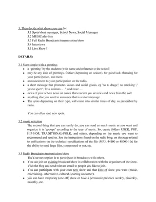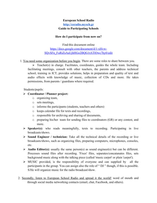 This document provides guidance for schools to participate in the European School Radio program. It outlines several roles that students and teachers can take on, such as speaker, sound engineer, and audio editor. It then describes different types of content schools can contribute, including short messages, music playlists, full radio broadcasts, interviews, and live shows. Details are provided on how to create and submit each type of content. Schools are encouraged to listen to and help spread the word about European School Radio. Suggestions and comments from participating schools are welcomed to help improve the program.