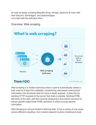 This document serves as a guide on web scraping using Python libraries such as Beautiful Soup, Scrapy, and Selenium, emphasizing the critical role of web scraping in data acquisition for businesses. It outlines the importance of extracting data efficiently for competitive analysis, market research, and decision-making, while detailing various libraries along with their features, advantages, and disadvantages. Overall, it encourages companies to leverage web scraping technologies to gain a competitive edge and make informed data-driven decisions.