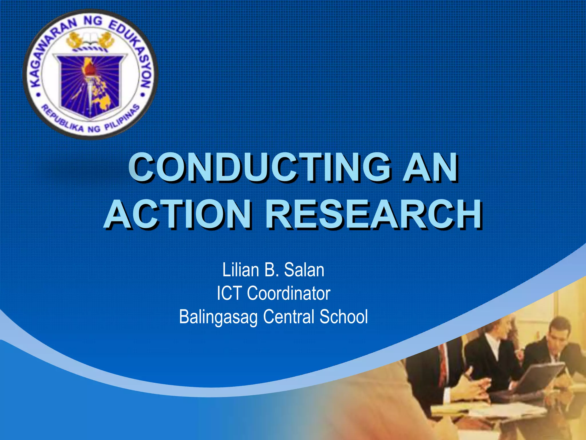 This document defines and explains the process of action research. It states that action research is a process where teachers study their own instructional practices and student learning in order to improve. The process involves identifying a classroom problem, developing a plan to address it, collecting and analyzing data, and making instructional decisions and sharing results. It then outlines the phases of action research in more detail, including identifying problems, developing a research plan, collecting and analyzing data from multiple sources, and drawing conclusions to continue improving teaching practices.