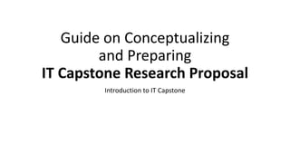 The document serves as a guide for conceptualizing and preparing an IT capstone research proposal, emphasizing the importance and structure of capstone projects in university curricula. It outlines various research types—including basic, applied, and participatory research—and the characteristics of effective objectives and purpose statements. Furthermore, it provides guidance on creating research titles that accurately capture the study's focus and engage readers.