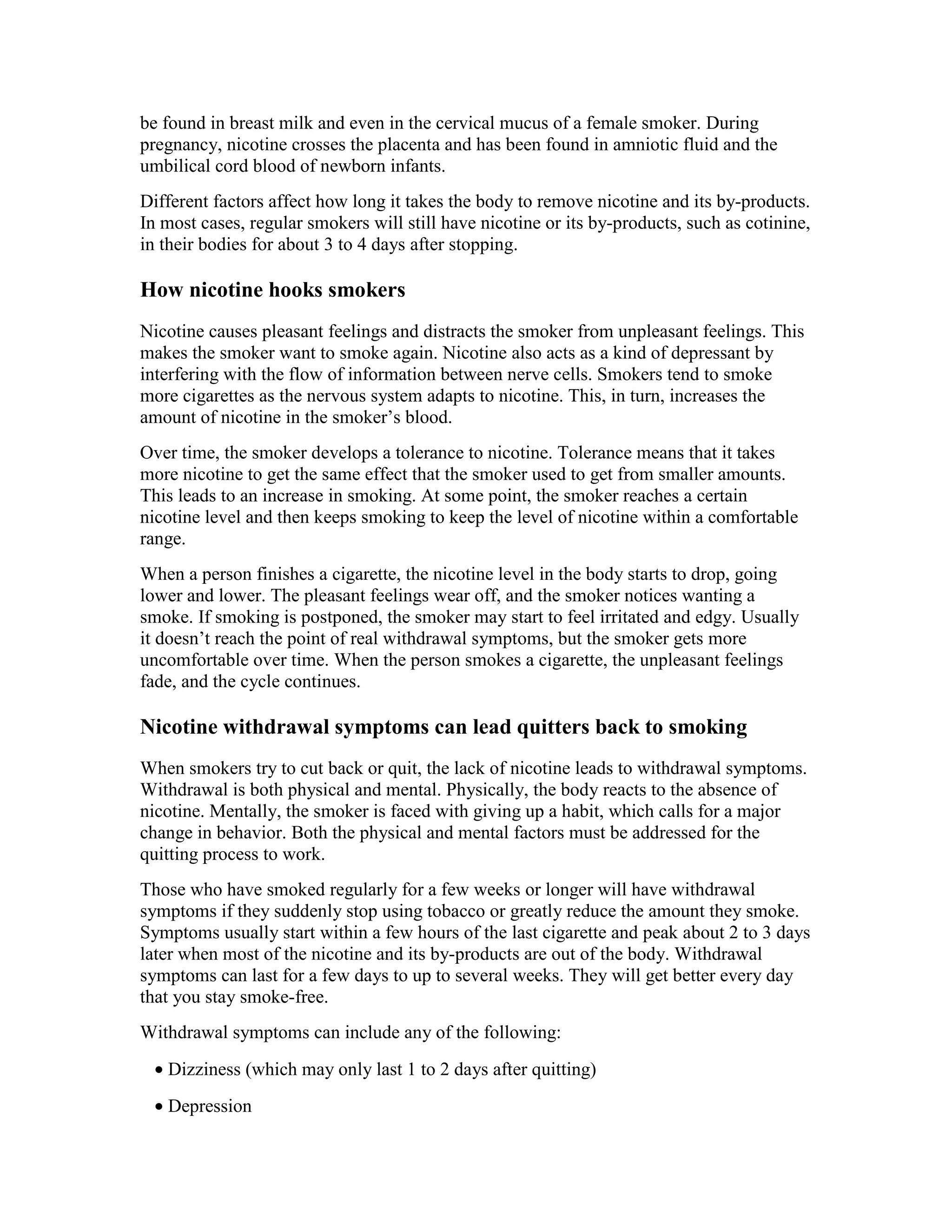 This document provides information to help smokers quit smoking. It discusses how nicotine is highly addictive physically and mentally. Withdrawal symptoms can occur when quitting due to nicotine addiction and can include cravings, irritability and sleep issues. However, health benefits are seen quickly, such as improved lung function within weeks. Long term benefits include greatly reduced cancer and heart disease risks after 10-15 years of not smoking. Quitting can add years to one's life and improve health. Support is available to address both the physical and mental parts of nicotine addiction.