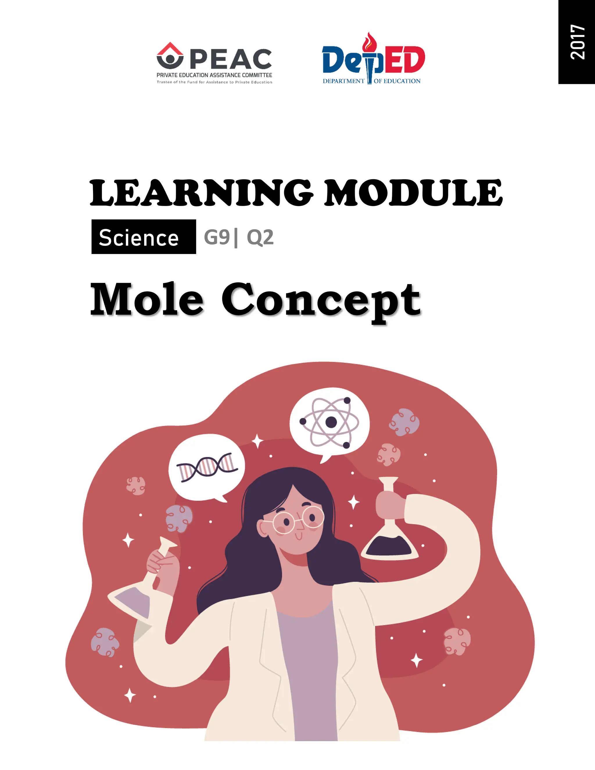 The document is a learning module for Grade 9 science, focusing on the mole concept, chemical bonding, and carbon compounds, developed by the Private Education Assistance Committee of the Department of Education. It emphasizes online learning, supports independent study, and includes activities like reading instructions, taking notes, and engaging in investigations to enhance understanding of chemical bonds and compounds. The learning module aligns with the K to 12 curriculum and encourages teachers to create standards-based learning plans.