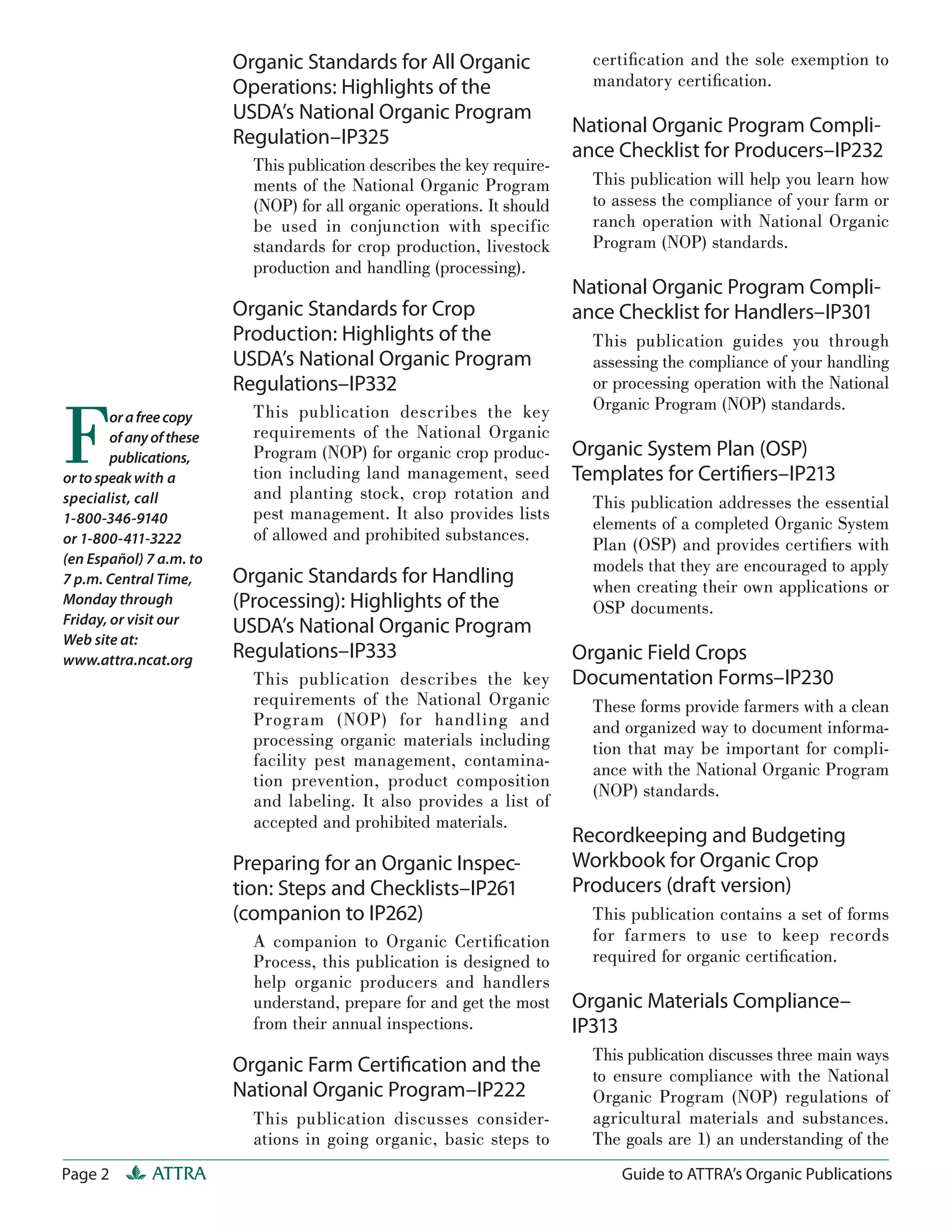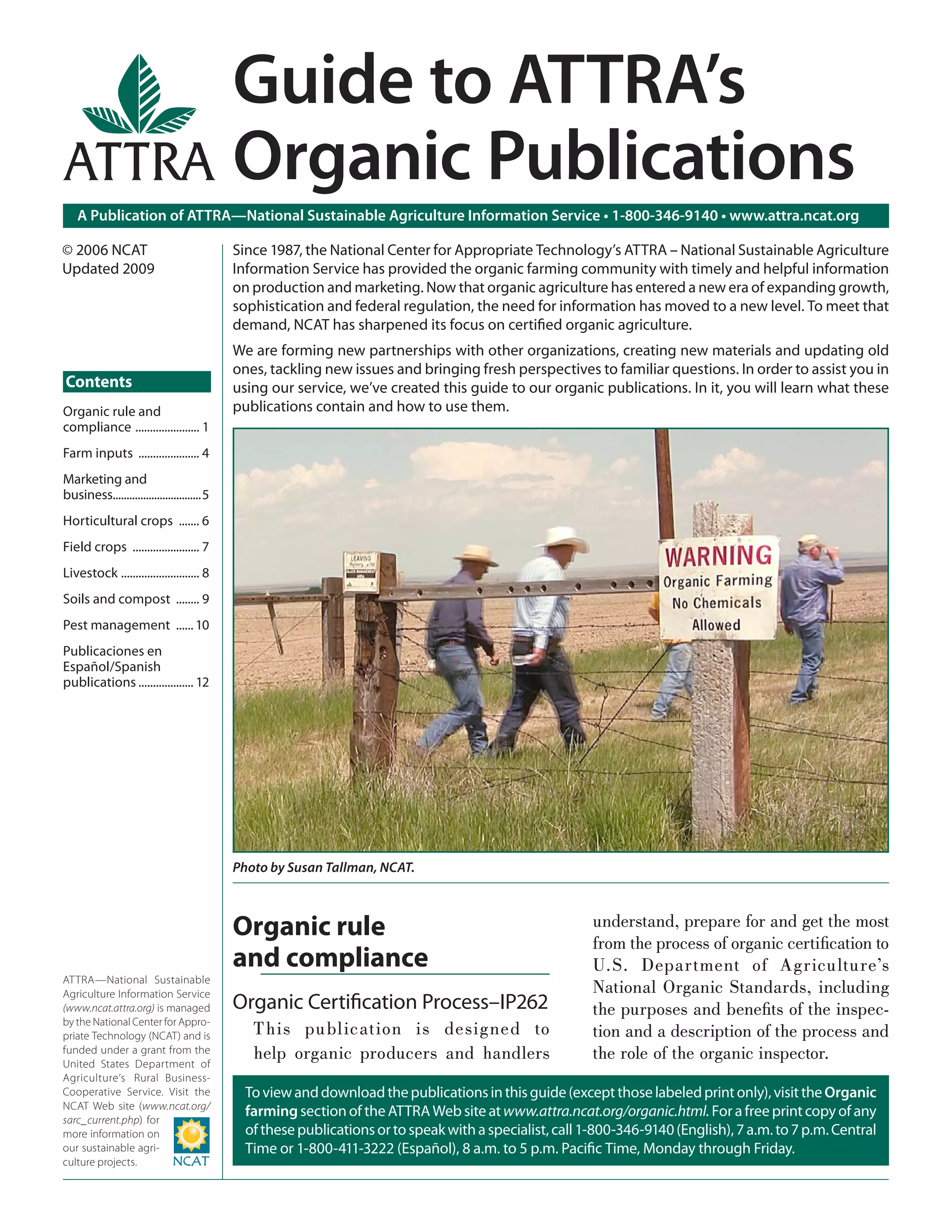 This document provides a guide to publications from ATTRA (Appropriate Technology Transfer for Rural Areas) related to organic agriculture. It summarizes 14 publications that cover topics such as organic certification requirements, compliance, crop and livestock production, marketing, and pest management. The publications provide information on the USDA organic regulations and guidance for developing organic system plans and recordkeeping to meet certification standards. Readers can contact ATTRA to request print copies or speak with specialists about the publications.