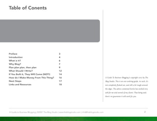 This introduction discusses why the author wrote another guide on business blogging despite there already being many guides available. The author explains that blogging allowed him to leave his full-time job and start a successful freelance business by connecting him with clients, suppliers, and collaborators. His blogs led directly to new business opportunities and allowed him to do work that he is passionate about. The author hopes this guide will help others have similar success through business blogging by outlining practical strategies and planning advice.