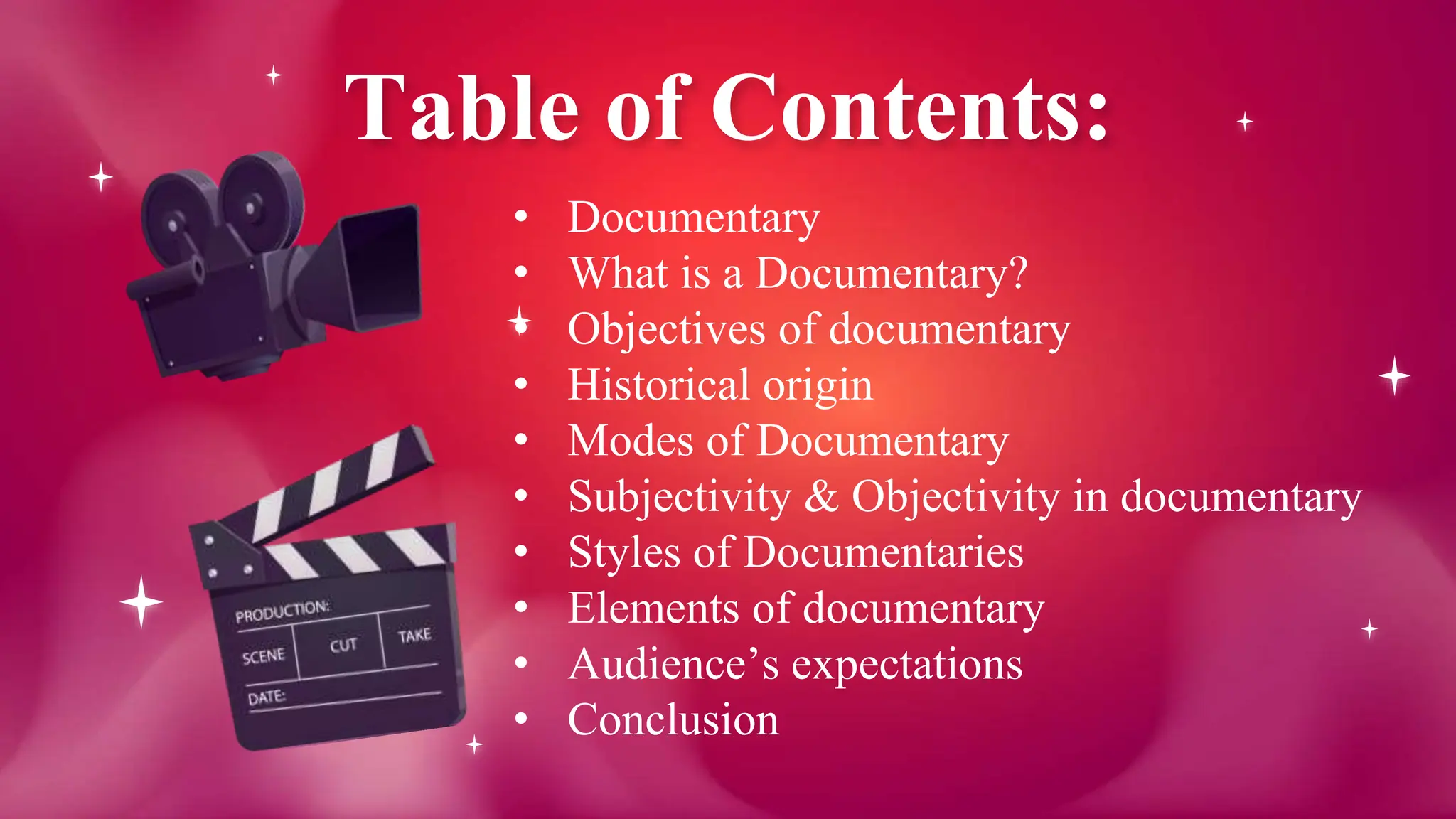 This document provides an overview of documentaries, including their objectives, historical origins, modes, subjectivity vs objectivity, styles, elements, and audience expectations. It begins with defining documentaries as factual films or programs about real world events meant to educate or entertain. It then discusses the objectives of documentaries like entertaining, educating, persuading, interrogating, promoting, and preserving. The document also covers the early history of documentaries dating back to 1895 and influential documentaries from different time periods and countries. It outlines several modes of documentaries like observational, expository, participatory, reflexive, poetic, and performative. Additionally, it discusses subjectivity versus objectivity and various styles like travel, diary form,