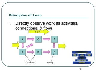 This document provides an overview of lean principles for leadership and personal practice. It discusses observing work flows, eliminating waste, establishing agreement on processes, using problem solving tools like the 5 Whys, creating a learning culture with Plan-Do-Check-Act cycles, and leadership techniques like building tension rather than stress and eliminating fear and comfort. For personal lean, it recommends always working for the customer, problem solving at a relationship level, managing commitments, using tools like 5 Whys, and directly observing processes.