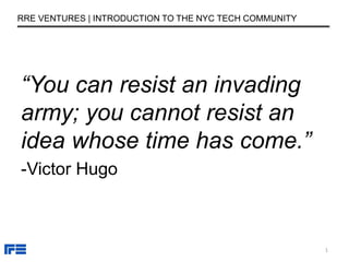 The document provides an overview of the New York City tech community, discussing its welcoming, collaborative, and innovative environment. It details the various components of the ecosystem, including startups, investors, and government initiatives aimed at fostering growth. Additionally, it highlights notable founders and companies within the NYC tech landscape, along with macro trends and investment activity.