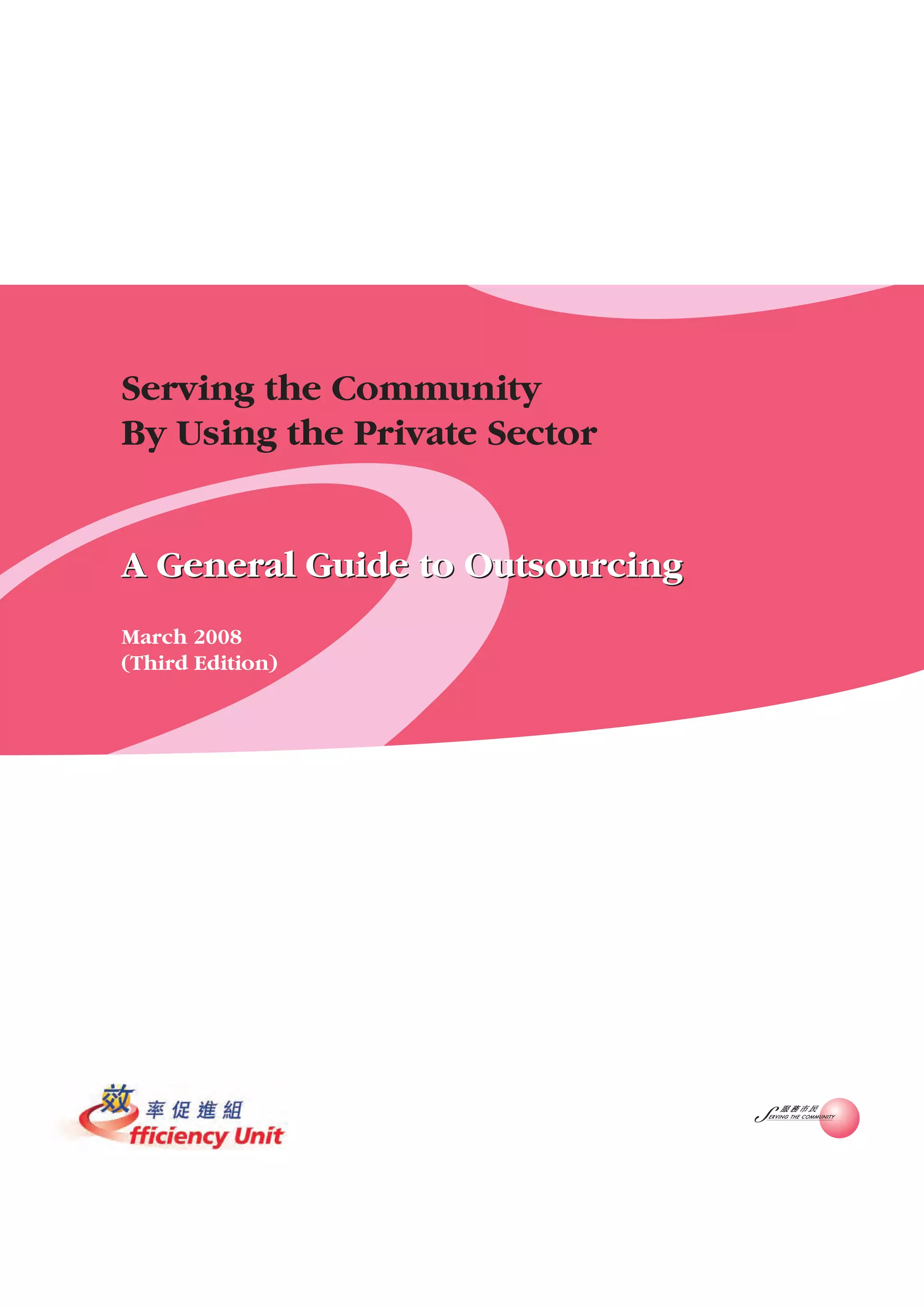 This document provides guidance on outsourcing services for the Hong Kong government. It discusses the vision and mission of the Efficiency Unit, which aims to be the preferred consulting partner for government bureaus and departments to advance world-class public services. The document outlines reasons for outsourcing including focusing on core services, accessing skills, and improving service quality. It emphasizes that outsourcing should achieve value for money. The document provides a multi-stage process for outsourcing and considerations at each stage such as reviewing required services, tendering and selecting contractors, and contract management.