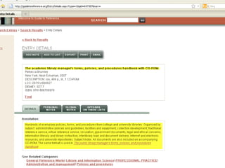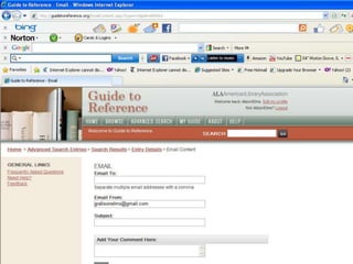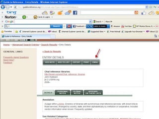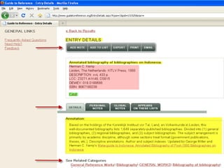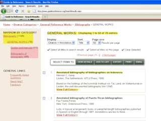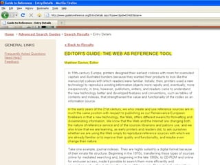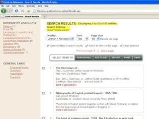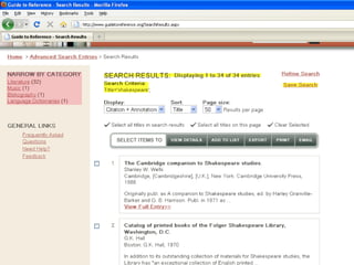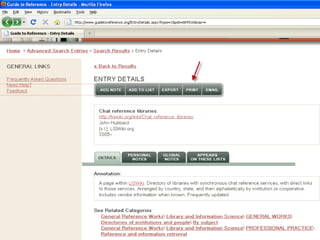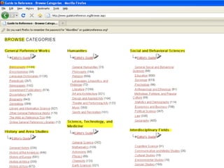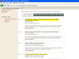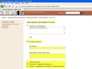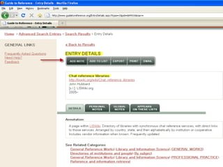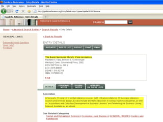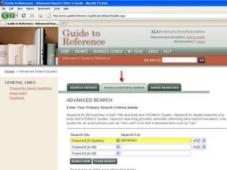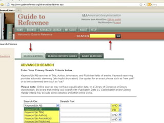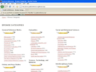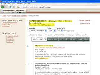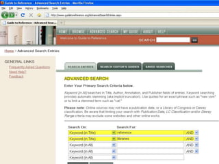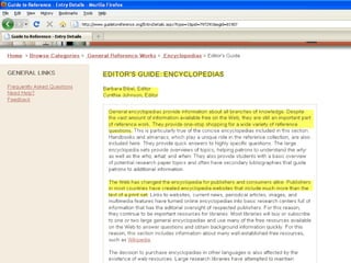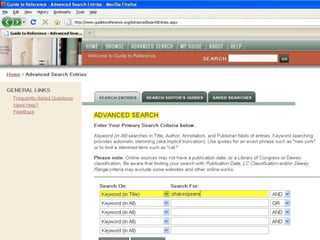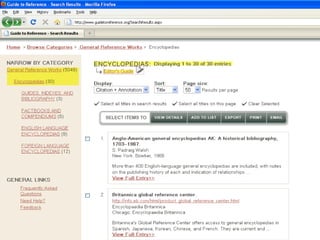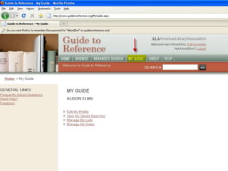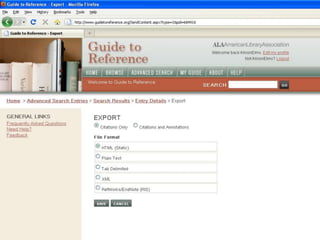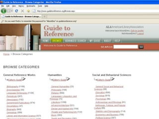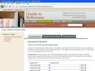 The webinar introduces Guide to Reference, a foundational reference tool for librarians, researchers, and students. It provides over 17,000 evaluated reference sources across many disciplines. The webinar demonstrates how Guide to Reference can help with reference work, collection development, and teaching through its comprehensive and up-to-date annotations of sources, customizable search features, and ability to create resource lists. Questions from attendees are addressed at the end.