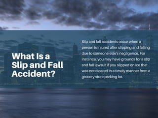 Slip and fall accidents arise when an individual is injured due to another's negligence, often under premises liability where property owners fail to maintain safety. Common causes include slipping on ice, tripping over hazards, or falling due to poor property upkeep, potentially leading to serious injuries and significant compensation claims. Reid B. Wissner's law firm offers assistance to victims to secure compensation for medical expenses, lost wages, and pain and suffering.