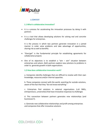 This document provides guidance for submitting proposals to Colombia CO4, a collaborative innovation program. It summarizes what collaborative innovation entails, including identifying challenges, finding external solutions, and generating new relationships. It then outlines the program, including the 11 challenge holding companies, how solutions will be selected, and the roles of iNNpulsa and SENA in facilitating partnerships between companies and solvers. Key terms like "solver," "challenge," and "stages" are also defined in a glossary section.