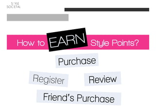 The document discusses how to earn and use "Style Points" on a shopping website. It outlines several ways to earn points including registering an account, referring friends who purchase items (friends also earn points), and writing reviews of purchased items. The points can then be used to lower the prices of items by adjusting a slider and reducing the number of points in one's account. The key benefits are earning points through social actions and having flexibility in how many points to spend on discounts.