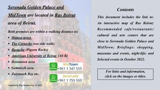 This document provides information about two hotels in Ras Beirut - Serenada Golden Palace and MidTown. It summarizes the surrounding amenities within walking distance, including cafes, restaurants, cultural centers, arts galleries, shopping areas, museums and nightlife. It also includes an interactive map of Ras Beirut and lists selected events happening in October 2022 in Beirut.