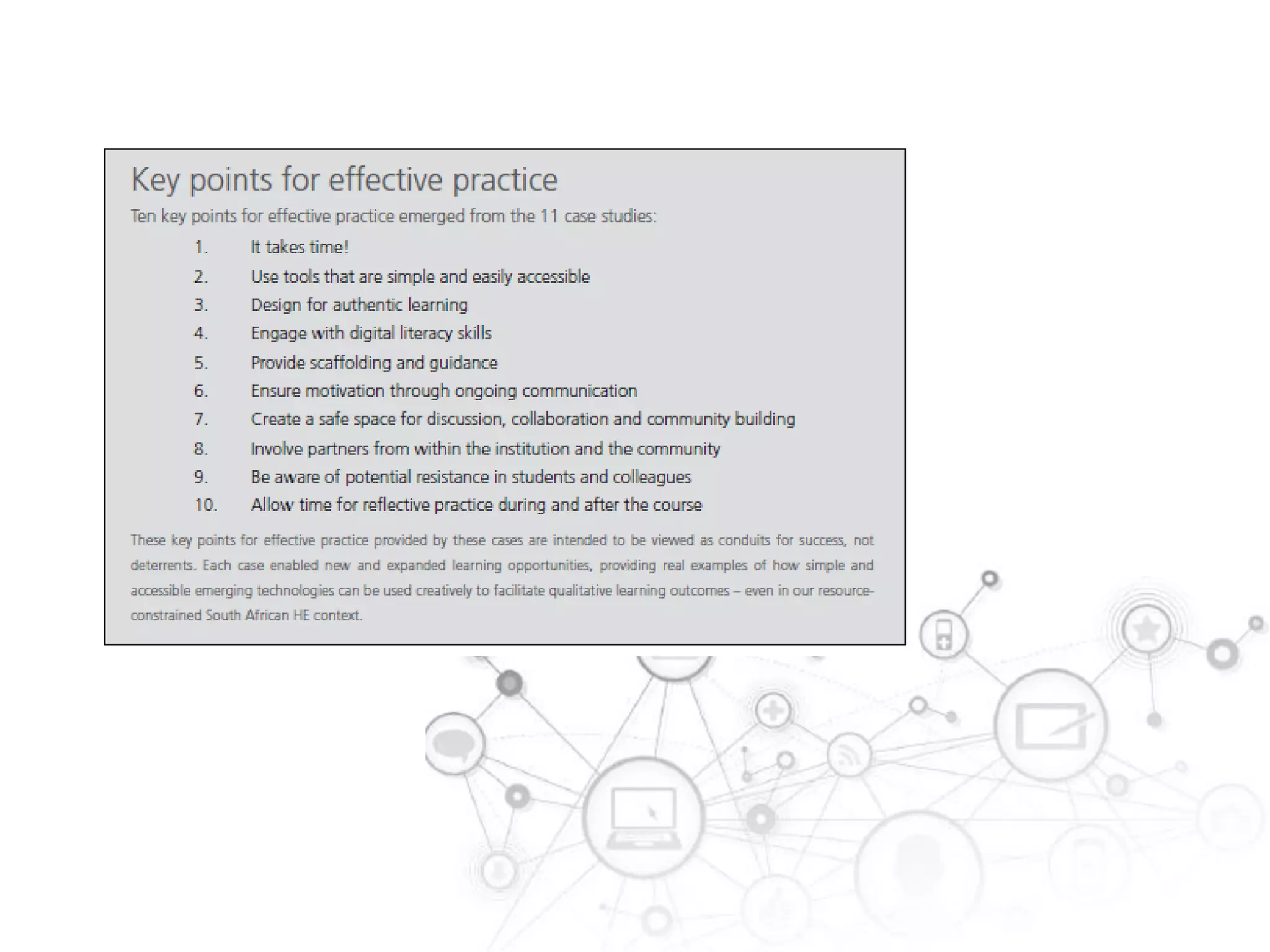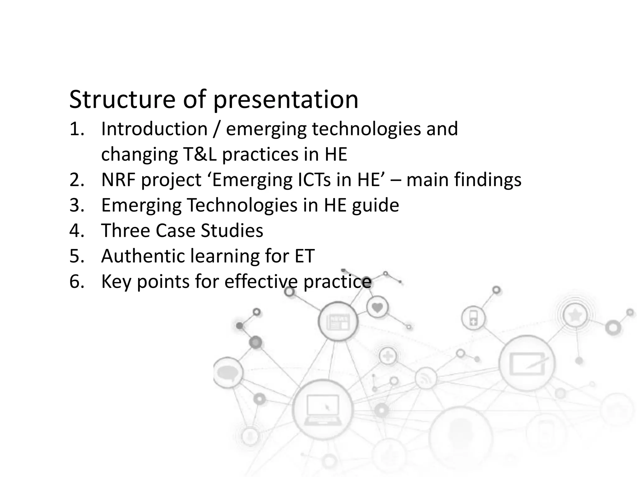 This document discusses emerging technologies and changing teaching and learning practices in higher education. It begins by providing context from various sources on the promise of emerging technologies and how institutions are struggling to keep up with innovations. It then summarizes the key findings of an NRF project on emerging ICTs in South African higher education. The project found that while technologies like social media and research databases are commonly used, adoption is driven more by passionate individuals than systemic institutional support. The document concludes by discussing case studies that illustrate how emerging technologies can facilitate authentic and collaborative learning when implemented effectively.