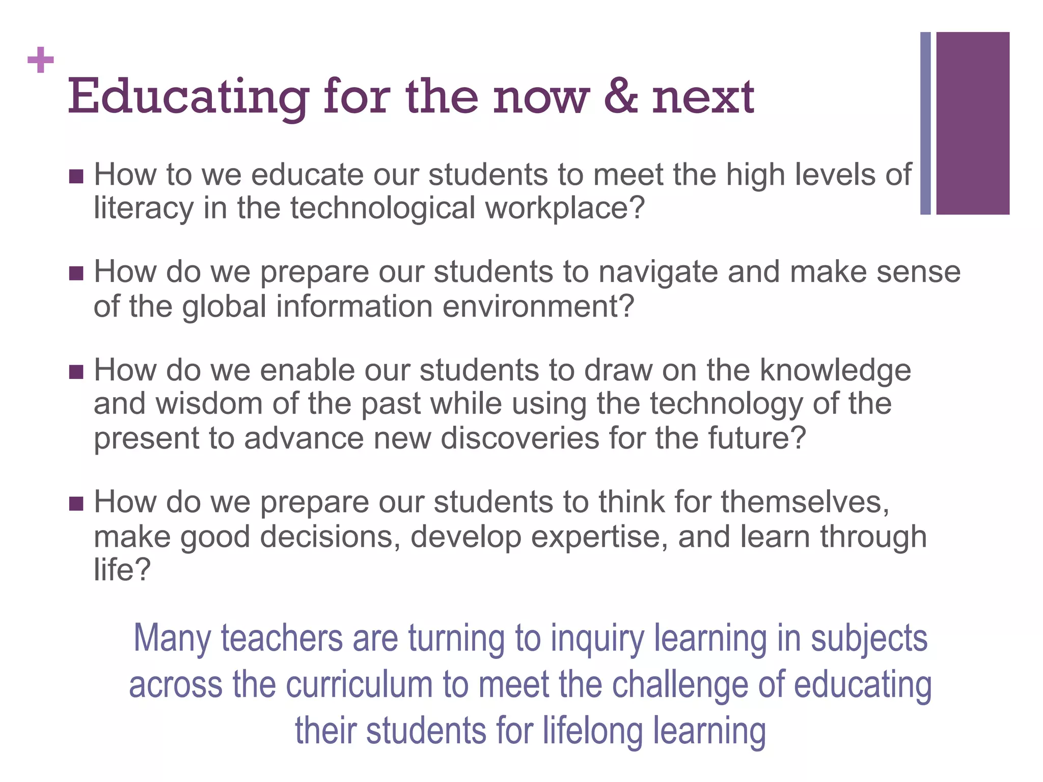 The document outlines an instructional framework for guided inquiry in education, emphasizing the importance of preparing students with essential skills like critical thinking, collaboration, and adaptability for a technology-driven future. It discusses the role of inquiry-based learning in fostering deep understanding, engaging students in the research process, and developing lifelong learning capabilities. Additionally, it highlights the significance of guided inquiry as a structured approach to help students navigate complex information and build competence in a collaborative environment.