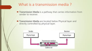 This document discusses different types of guided media used for data transmission. It describes twisted pair cable, coaxial cable, and fiber-optic cable. Twisted pair cable uses two insulated copper wires twisted together to reduce interference. Coaxial cable contains a central conductor surrounded by insulation and shielding to carry higher frequency signals. Fiber-optic cable uses glass or plastic strands to transmit data via light reflection down the core of the cable. The document provides diagrams of the cable structures and components.