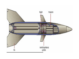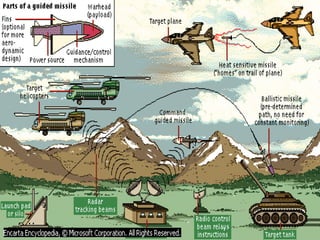 Guided missiles come in a wide variety of sizes and types, ranging from large strategic ballistic missiles carrying nuclear warheads to small portable rockets. They are guided towards their targets either remotely or through internal mechanisms. Some of the main types of missiles include surface-to-surface missiles like the V-1 and V-2, land-based strategic missiles, sea-based strategic missiles, cruise missiles, tactical missiles, and air-launched missiles. Guidance systems include remote control, wire-guidance which uses thin wires to guide the missile, and internal mechanisms for anti-satellite, anti-ballistic, and surface-to-air missiles used in air defense.