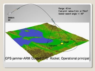 Guided missiles have evolved significantly over time and now play a major role in modern warfare. They can be guided through various technologies including laser, infrared, radar and GPS systems to precisely target enemies. Future smart weapons are anticipated to have greater autonomy, using advanced sensors and software to identify and engage threats on their own.