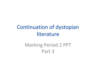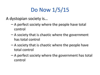 This document provides an overview of dystopian literature and elements that are commonly seen in dystopian works. It defines a dystopia as an unpleasant or oppressive society, unlike a utopia which is perfect. Dystopian governments are typically totalitarian in nature and prioritize the state over individual needs and wants. Dystopian protagonists often feel trapped and question the negative aspects of their society. The document discusses dystopian literature and elements such as archetypes, symbols, setting, plot, theme and tone. It provides examples of how the setting in The Hunger Games affects the story. Finally, it discusses summarizing passages from dystopian works.
