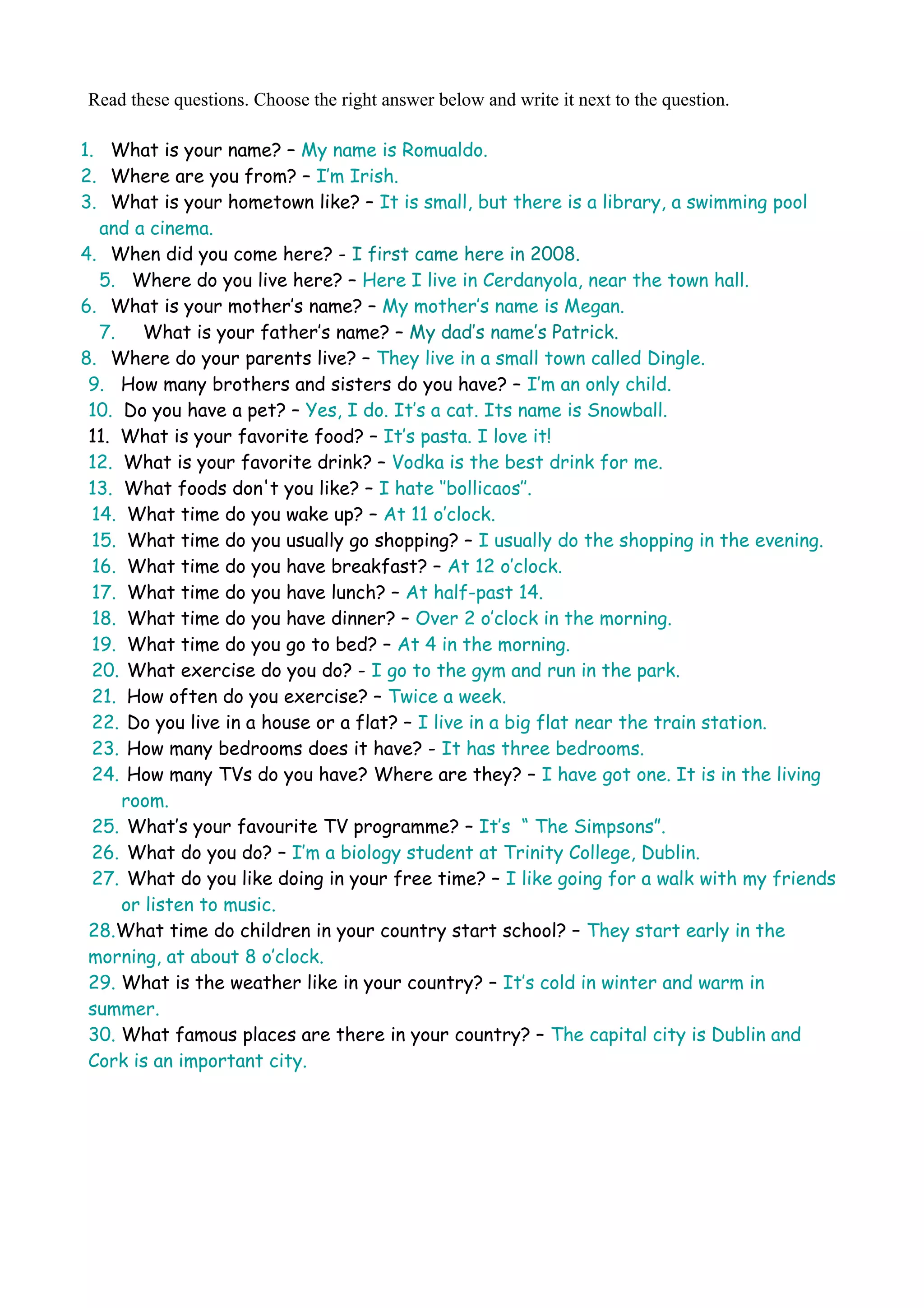 The document contains a series of 30 questions about a person named Romualdo who is from Ireland. Romualdo provides brief answers about his personal details like name, hometown, parents' names, living situation in Cerdanyola near the town hall, and being a biology student at Trinity College in Dublin. He also shares details about his daily schedule including late waking up, eating and exercising habits.