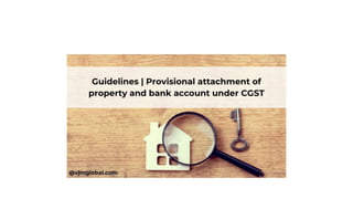 The document outlines the guidelines for the provisional attachment of property and bank accounts under the CGST Act, specifically detailing when and how such attachments can be executed by the Commissioner. It describes the necessary conditions, procedures, and illustrative cases justifying the attachment, such as failure to issue invoices or fraudulent tax activities. The document emphasizes the protective measures for revenue interests during pending proceedings against taxable persons.