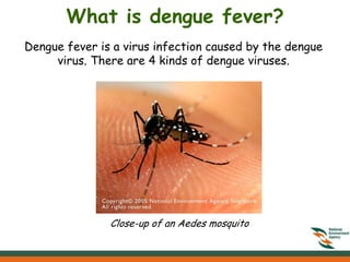 The document provides information on dengue prevention. It discusses what dengue is, its symptoms, and the mosquitoes that transmit it. It emphasizes the importance of eliminating stagnant water where Aedes mosquitoes can breed. It outlines specific breeding sites to target and provides a 10-minute exercise of inspecting and treating areas like flower vases, gutters, and plant saucers. Readers are encouraged to protect themselves from bites and educate others to help prevent dengue.