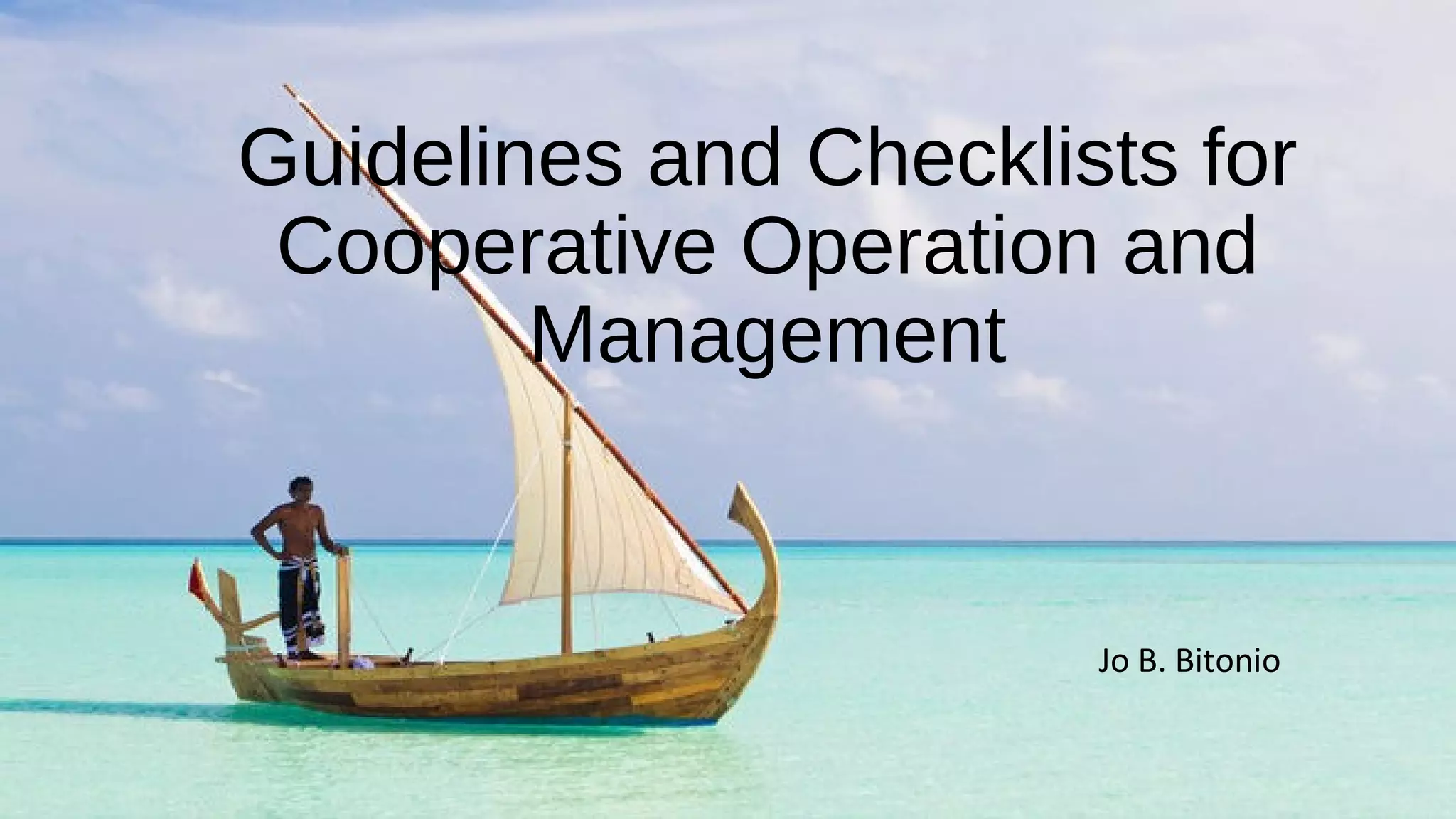 This document provides guidelines and checklists for cooperative operations and management in the Philippines. It summarizes programs, projects, policies, board resolutions, manuals, and a code of governance from CDA circulars and audit reports. The guidelines cover areas like development planning, annual planning and budgeting, financial reporting, hiring of auditors, benefits for employees, membership policies, manuals for operations and accounting, training programs, and sanctions for noncompliance. The supplemental rules specify training requirements for cooperative directors and officers.
