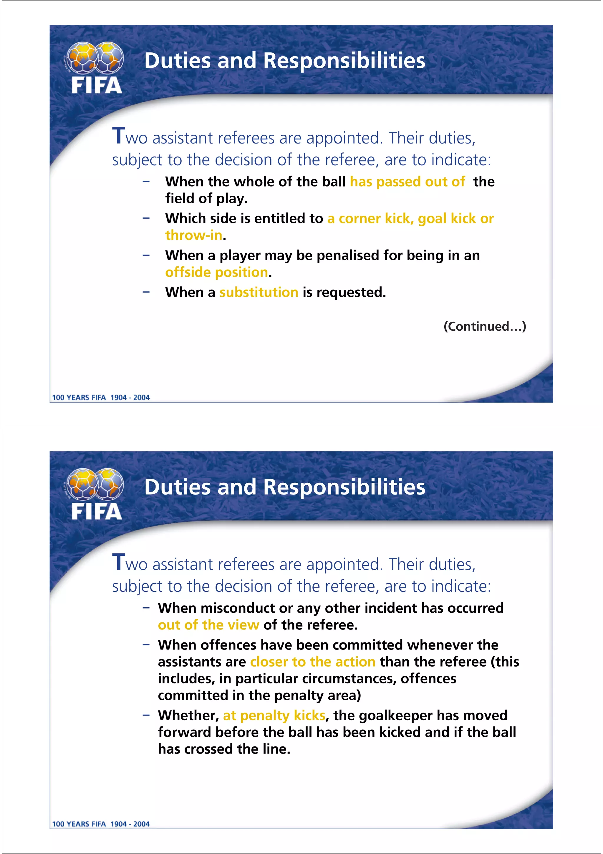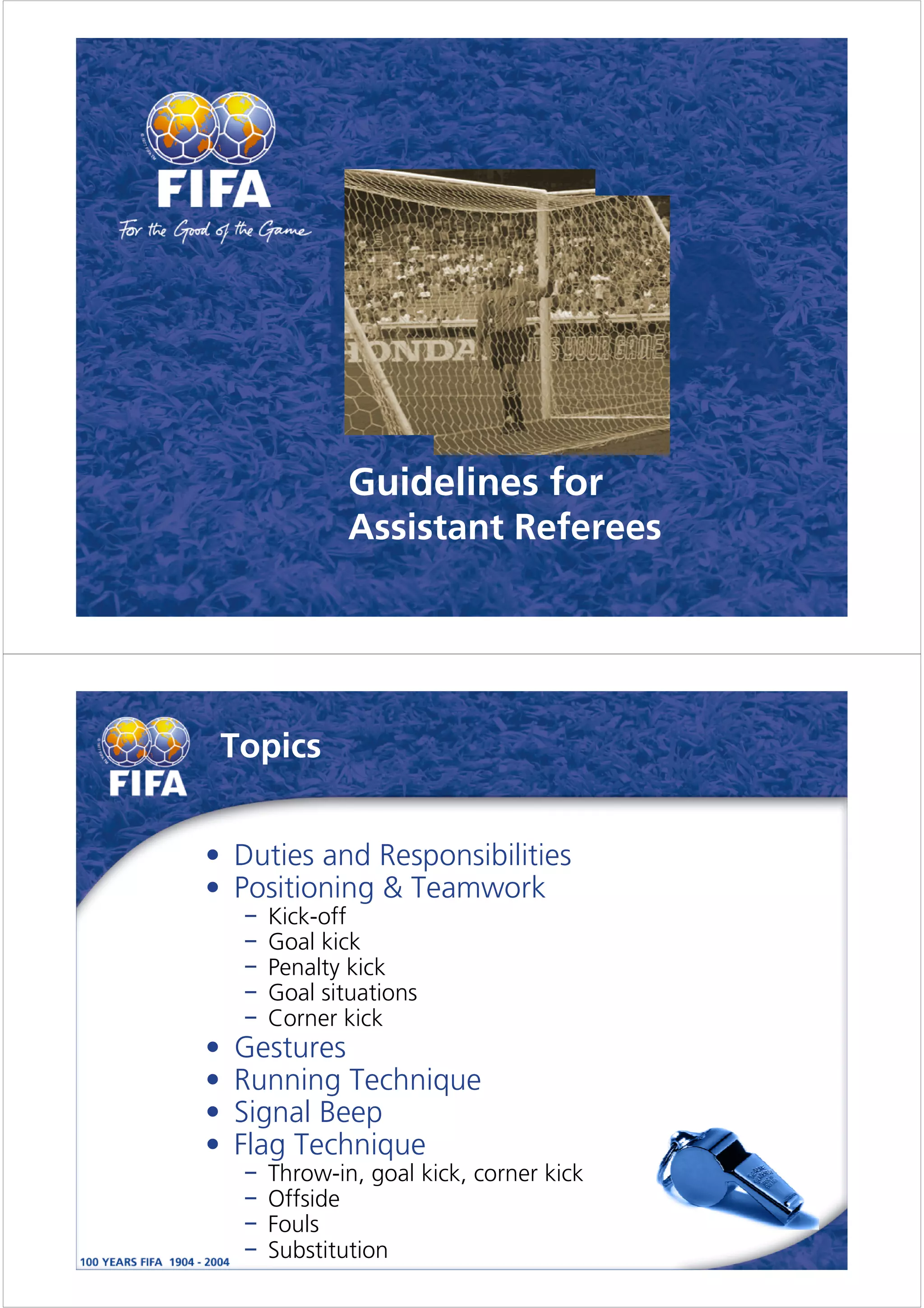 The document provides guidelines for assistant referees, outlining their duties and responsibilities which include indicating when the ball has left the field, corner kicks, fouls, and offsides. It discusses positioning for various plays like kickoffs, goal kicks, and corner kicks. It also covers gestures, running technique, use of the signal beep, and proper flag technique for signaling throws, fouls, goals, substitutions, and offsides to ensure the referee is informed of all key events.