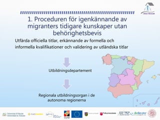 Förbättrade erkännandeprocedurer är en produkt av politiska reformer på nationell nivå och multilaterala avtal med andra stater för att komma fram till ett kortare, tydligare, mer effektivare erkännande av uppgifter. Dessa processuella uppgraderingar minskar den byråkratiska bördan för båda sidor, flykting, invandrare och mottagarlandet, vilket möjliggör snabb integration på arbetsmarknaden. Dessutom minskar det över kvalifikationer genom att erkänna, välja och rikta individer till rätt ackrediteringssystem och karriärväg. Icke desto mindre kräver denna praxis, eftersom den är starkt beroende av politisk vilja, en komplex politisk samförstånd om mycket känsliga frågor, eftersom det kan orsaka samtalseffekter och diskriminering med andra invandrare som inte är kvalificerade på de specifika områden som värdlandet kräver.När det gäller Spanien är erkännandet av utbildningsbevis för högre utbildning och yrkesutbildning utförs genom en fullständig valideringsprocess som erkänner likvärdigheten av intyg utfärdat av utländska och delvis validering av studier som utövas i utländska institutioner som efter avslutad studier kommer att leda till utfärdandet av ett spanskt intyg (Ministerio de Educación, Cultura y Deporte, 2018).